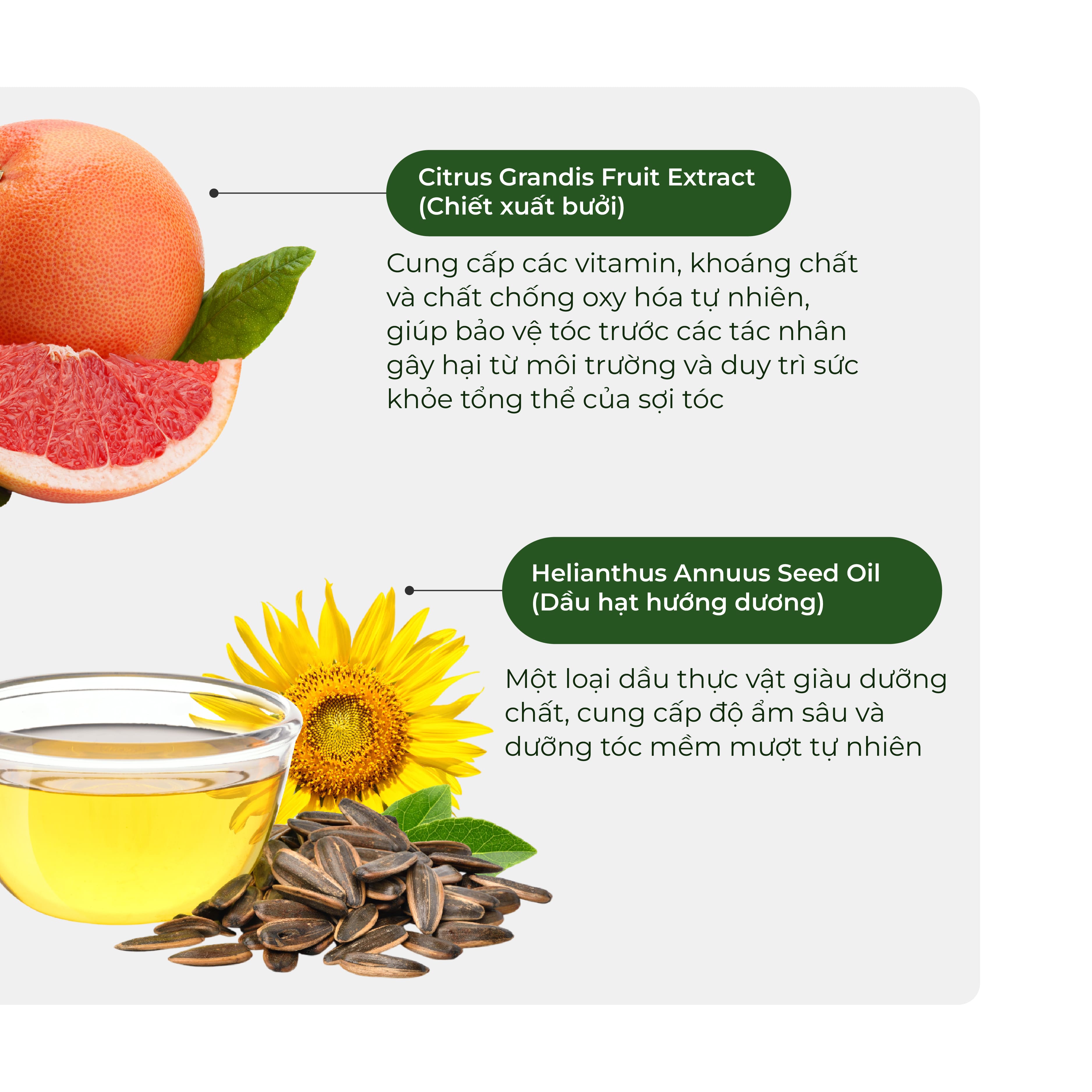 - Sunflower oil extract: Rich in essential fatty acids such as Omega-6,… capable of penetrating into hair fibers to maintain natural lipid membranes, thereby helping to prevent dehydration, moisturize and balance the natural pH of the scalp.