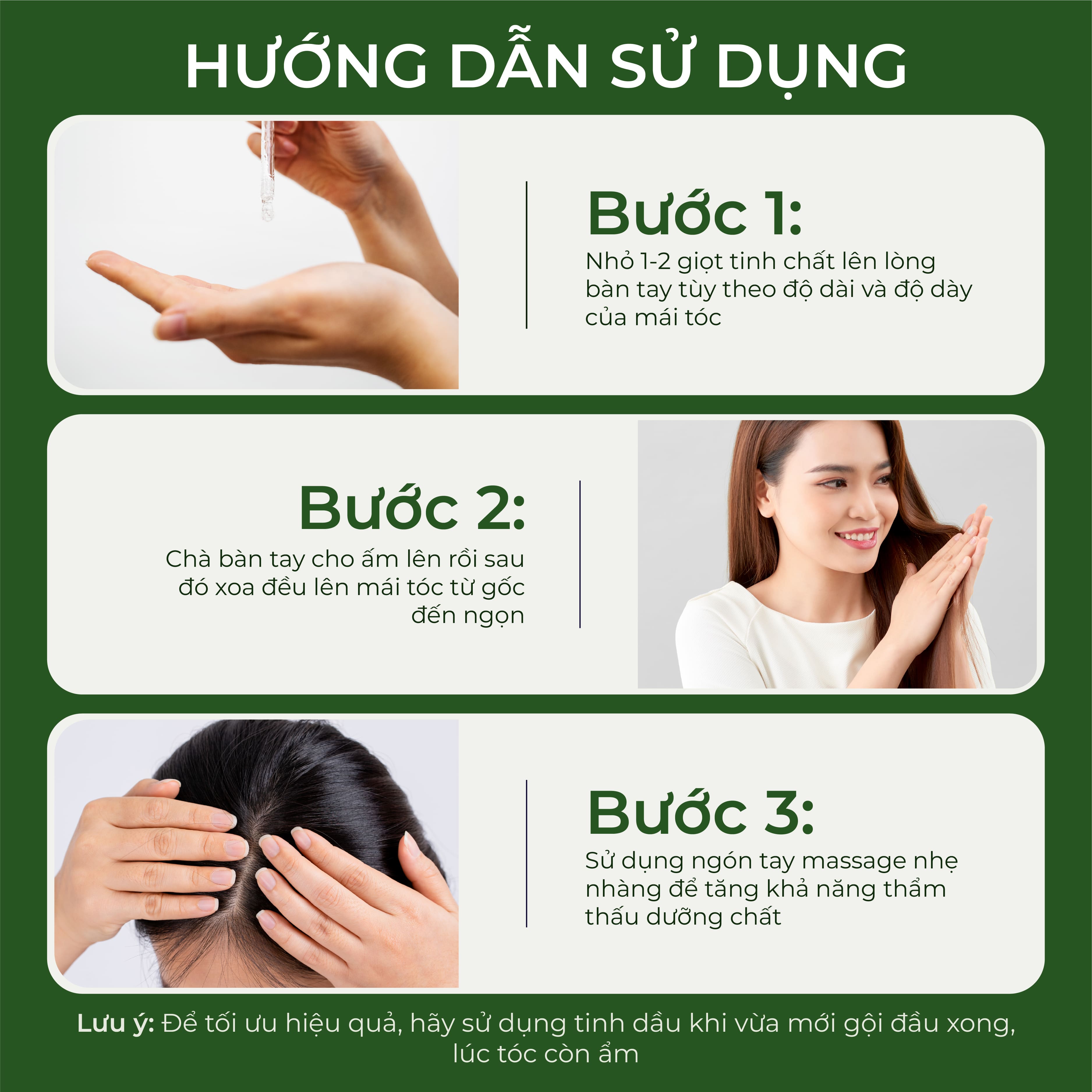 Step 1: Drop 1-2 drops of essence onto the palm of your hand depending on the length and thickness of your hair.