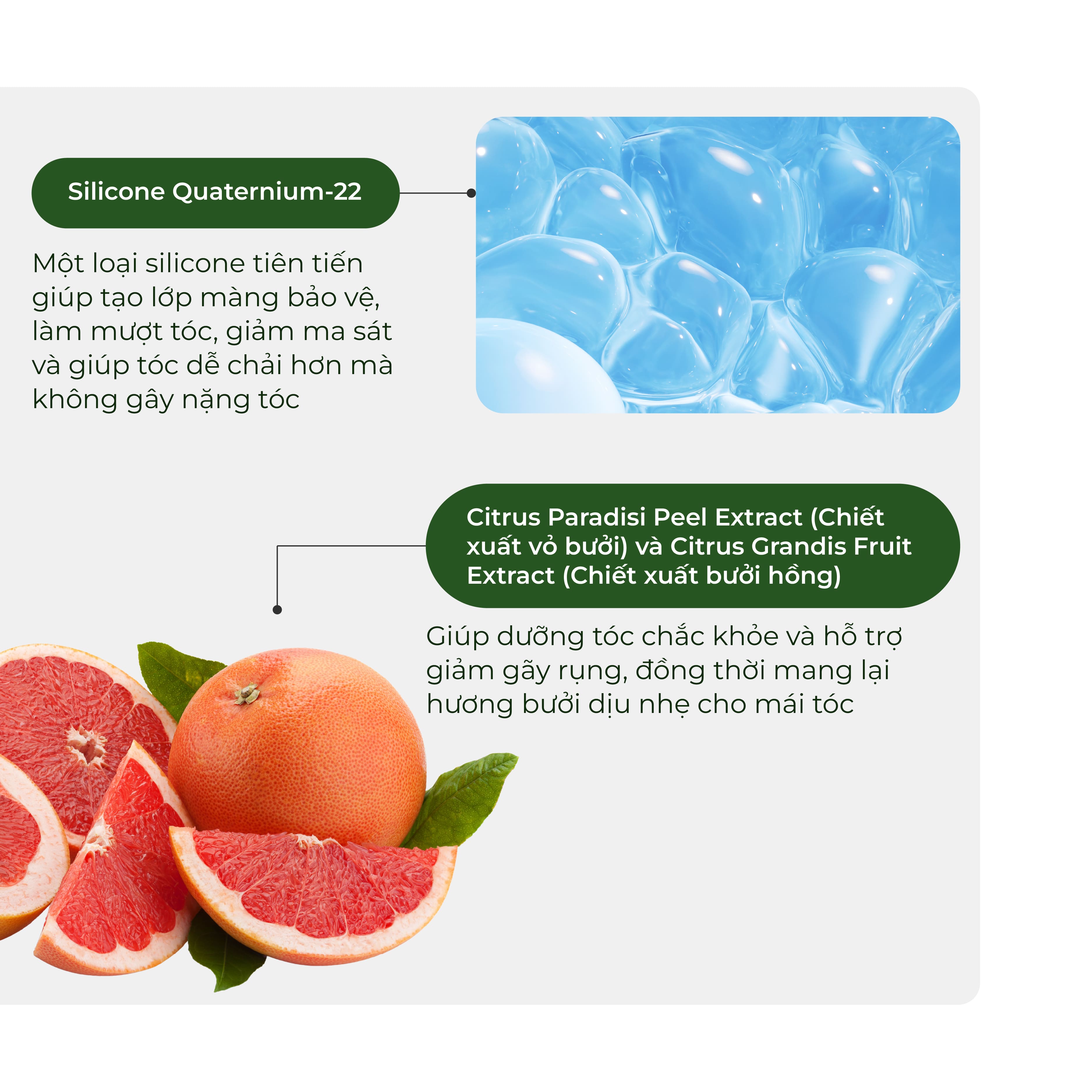 - Tam Hong grapefruit extract: Gently cleanses hair, helps reduce bacteria, reduces dandruff, improves dry and damaged hair, and enhances hair health.