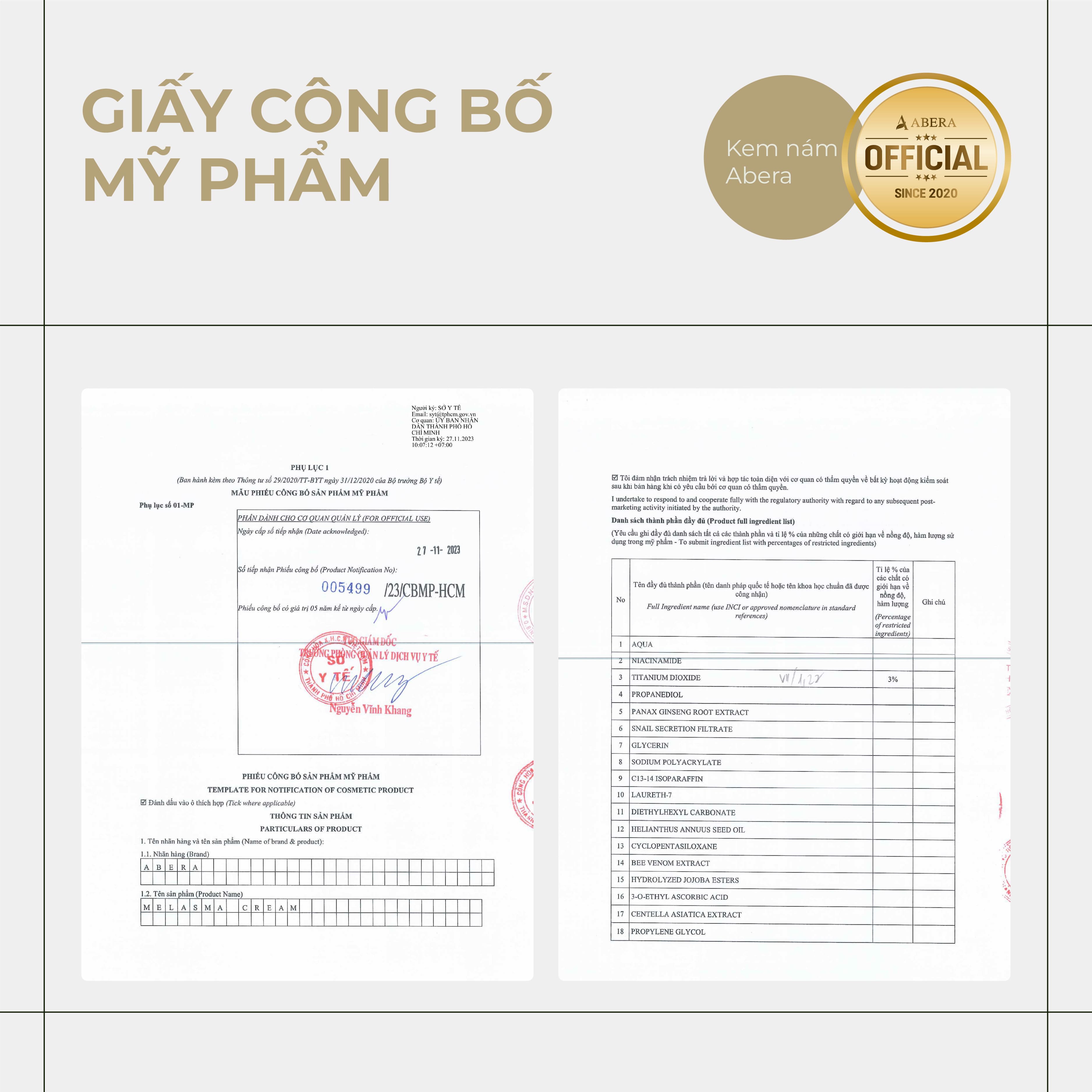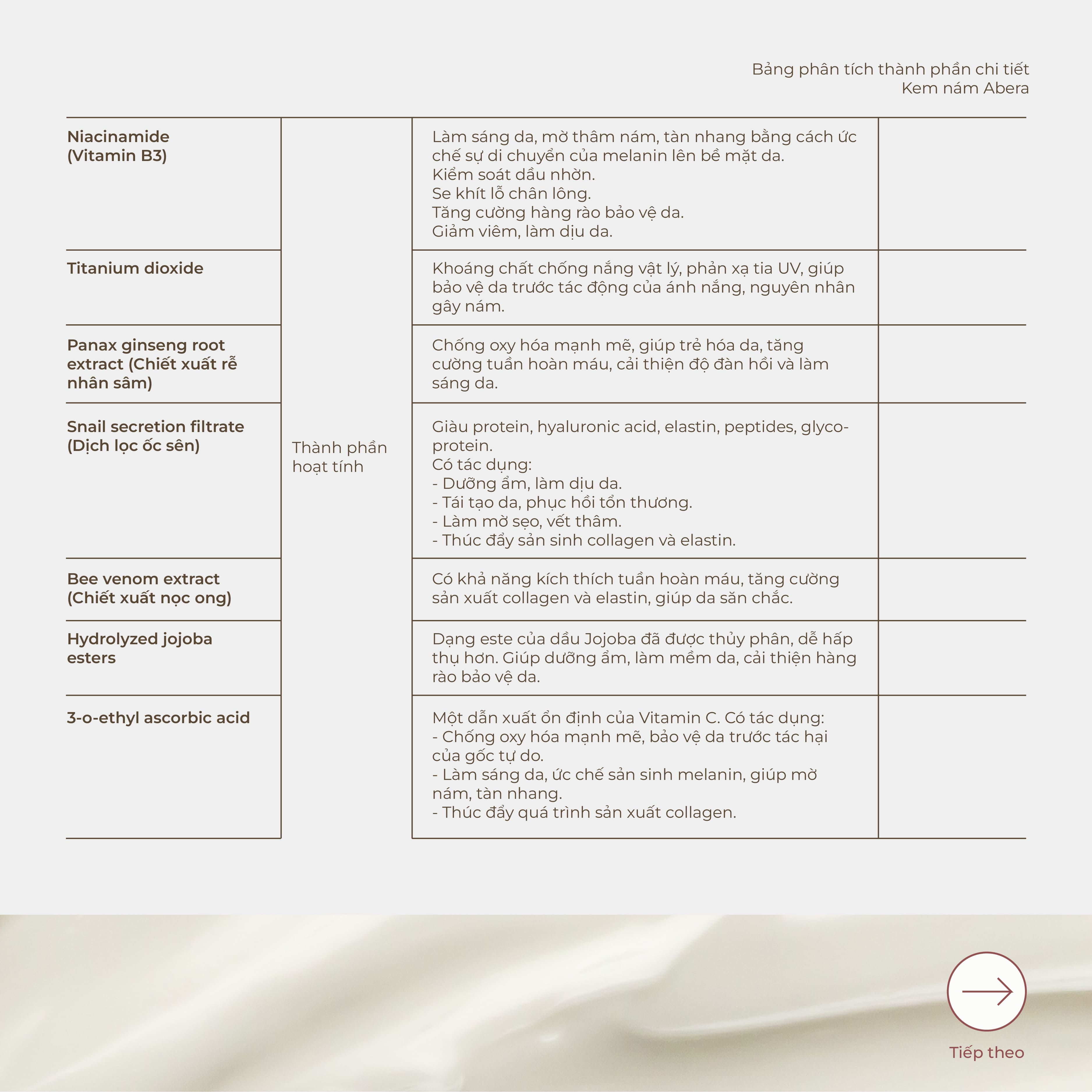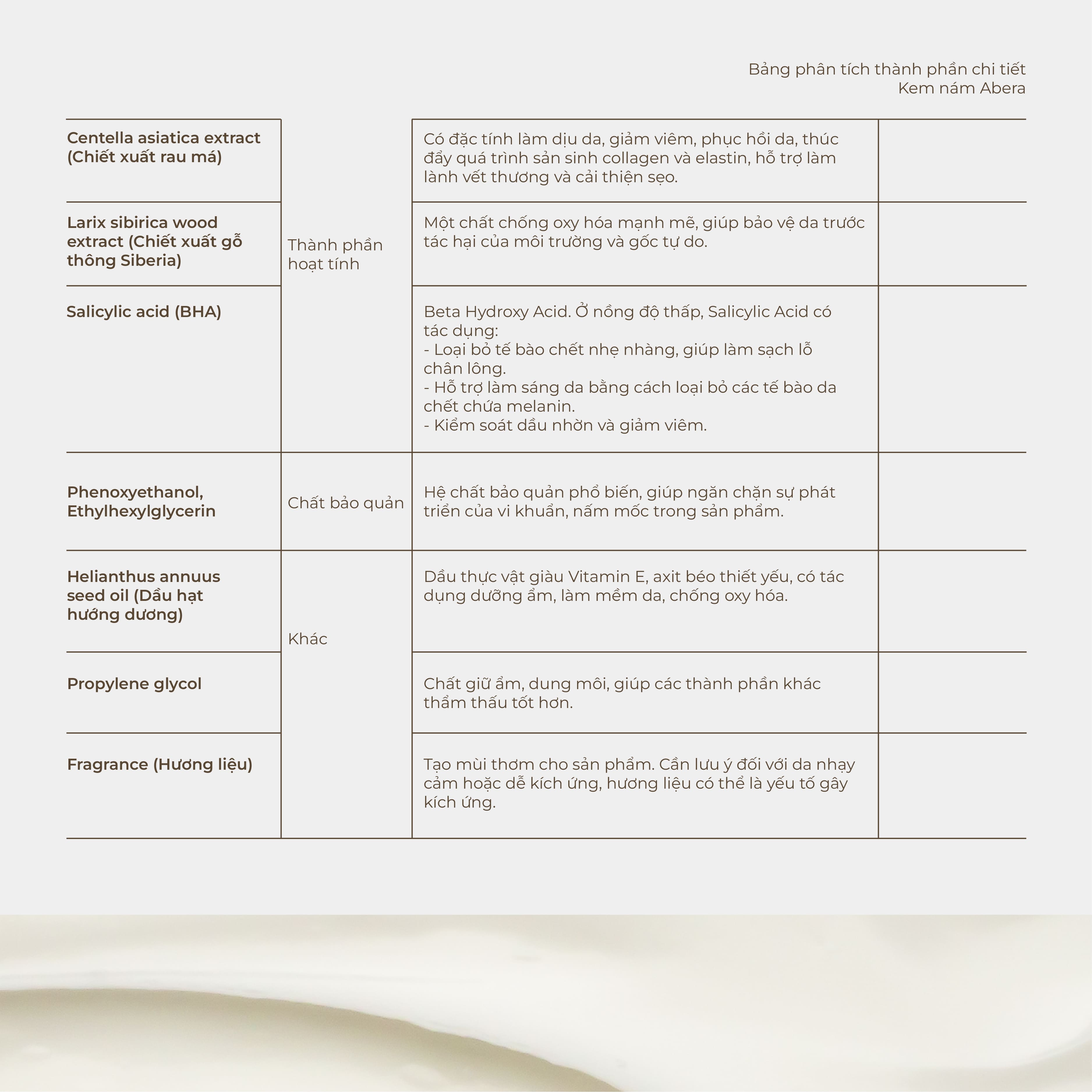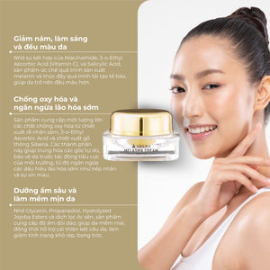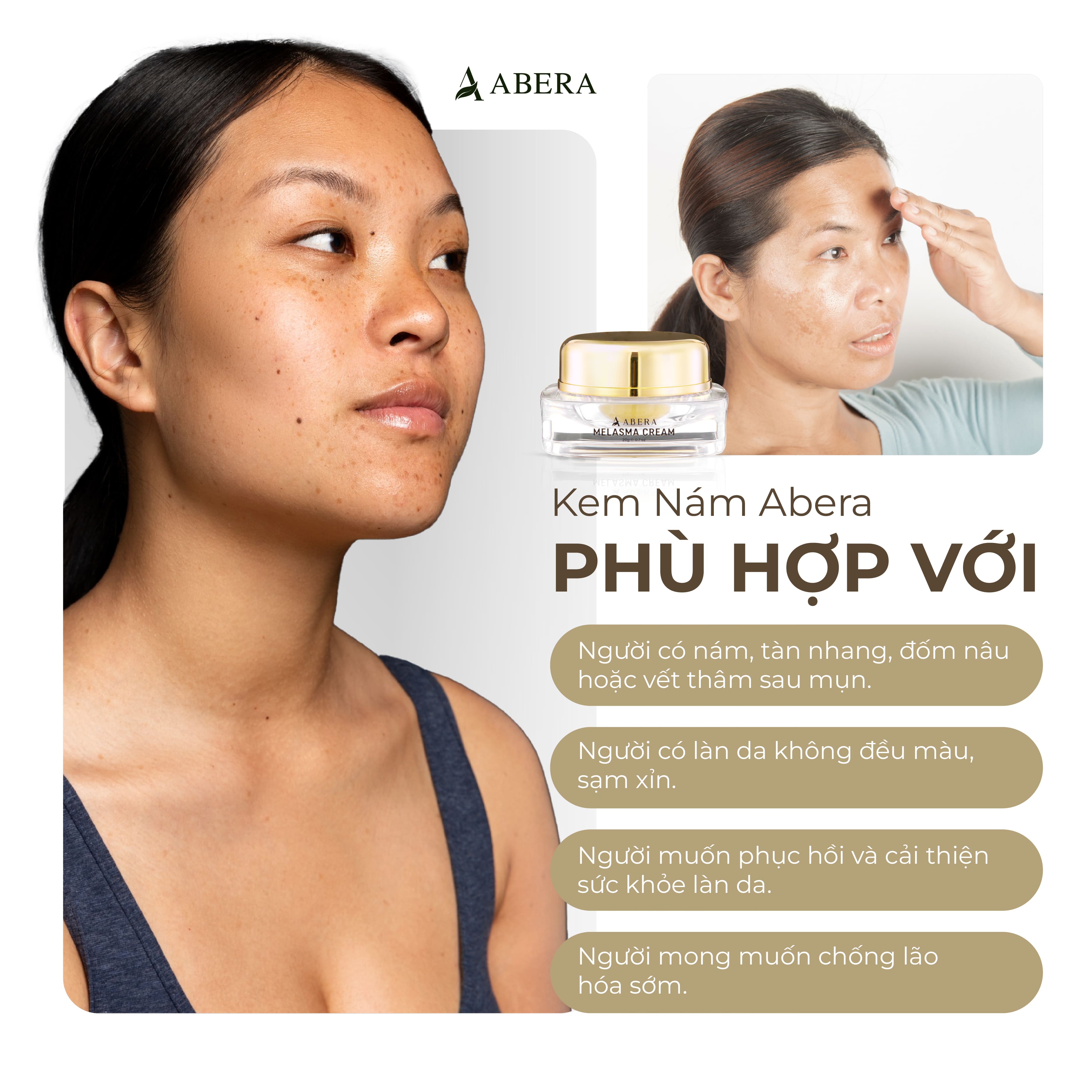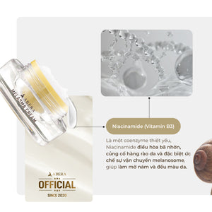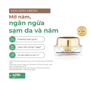 Abera Melasma Cream contains many highly effective ingredients in helping to prevent signs of aging, helping the skin remain youthful and smooth, such as ginseng, red reishi mushroom and red microalgae extract.`