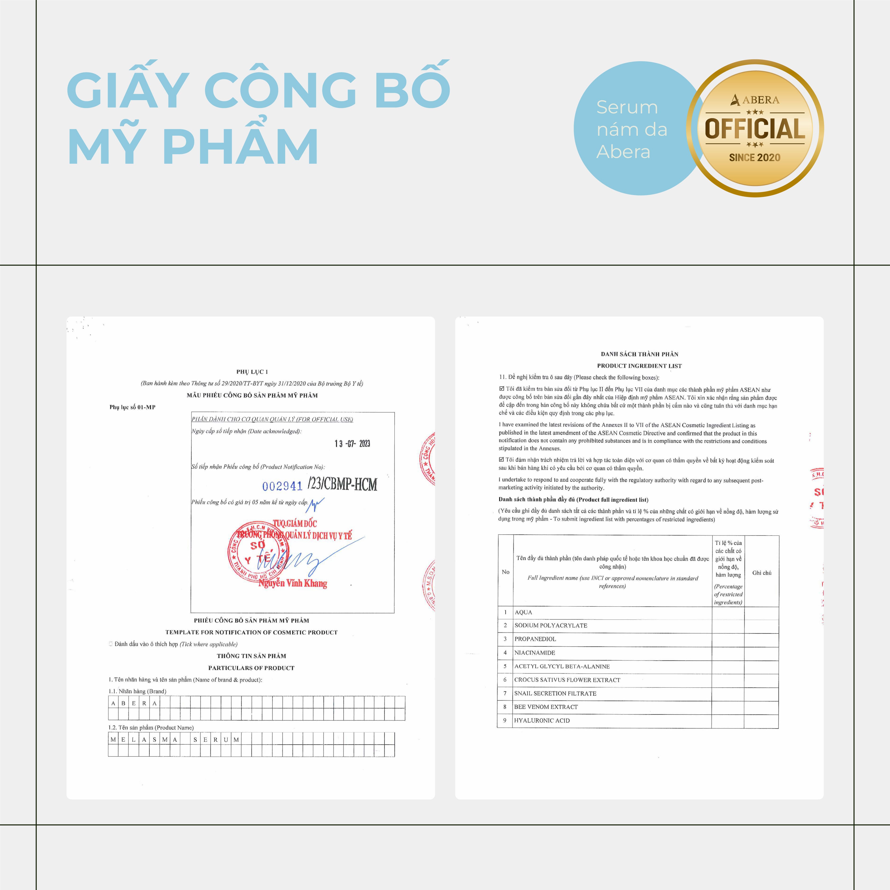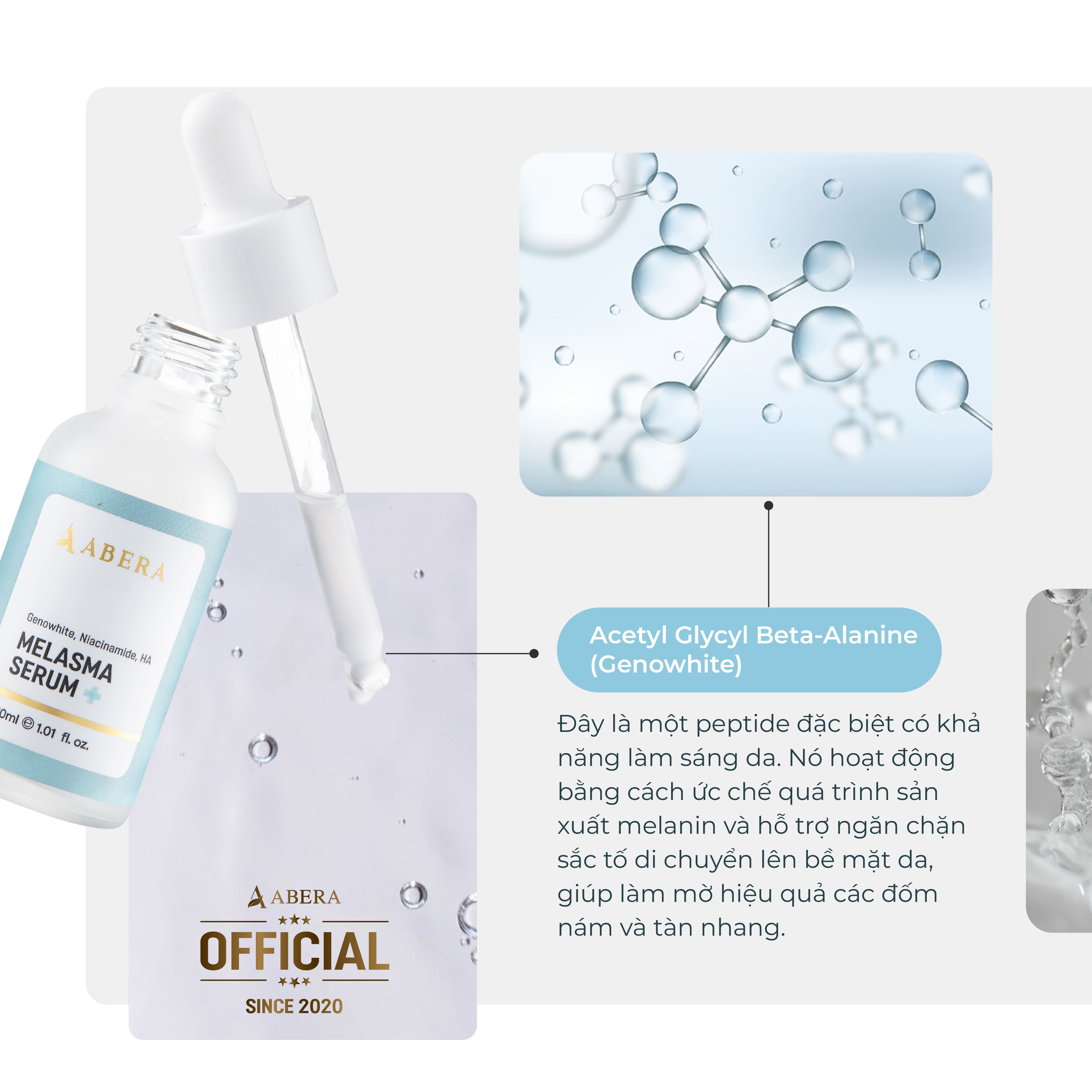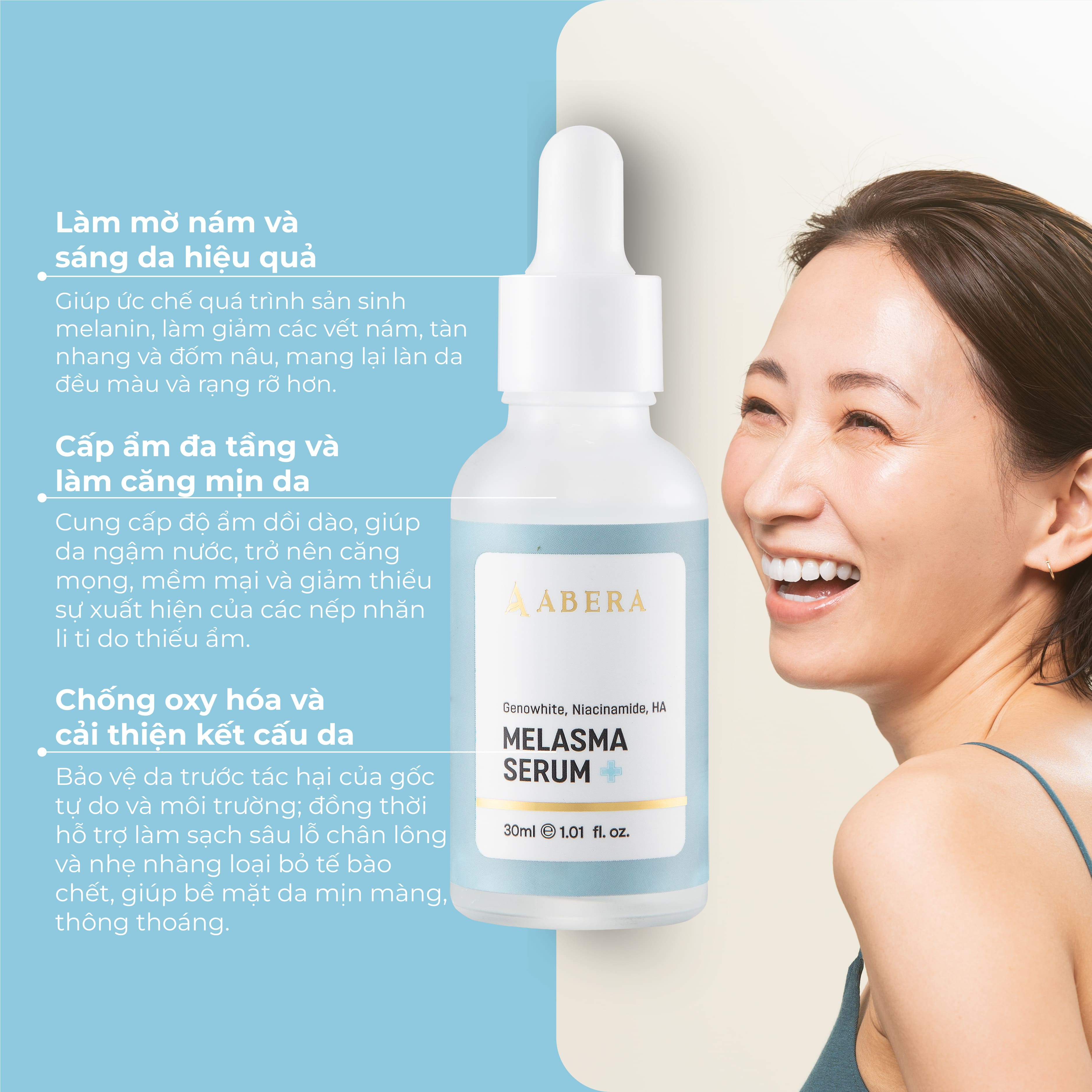 Abera Melasma Serum contains many natural ingredients, such as Corn extract and Saffron flower, and advanced active ingredients, such as Genowhite and Niacinamide, to help effectively prevent signs of skin ageing.