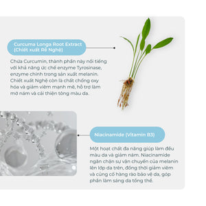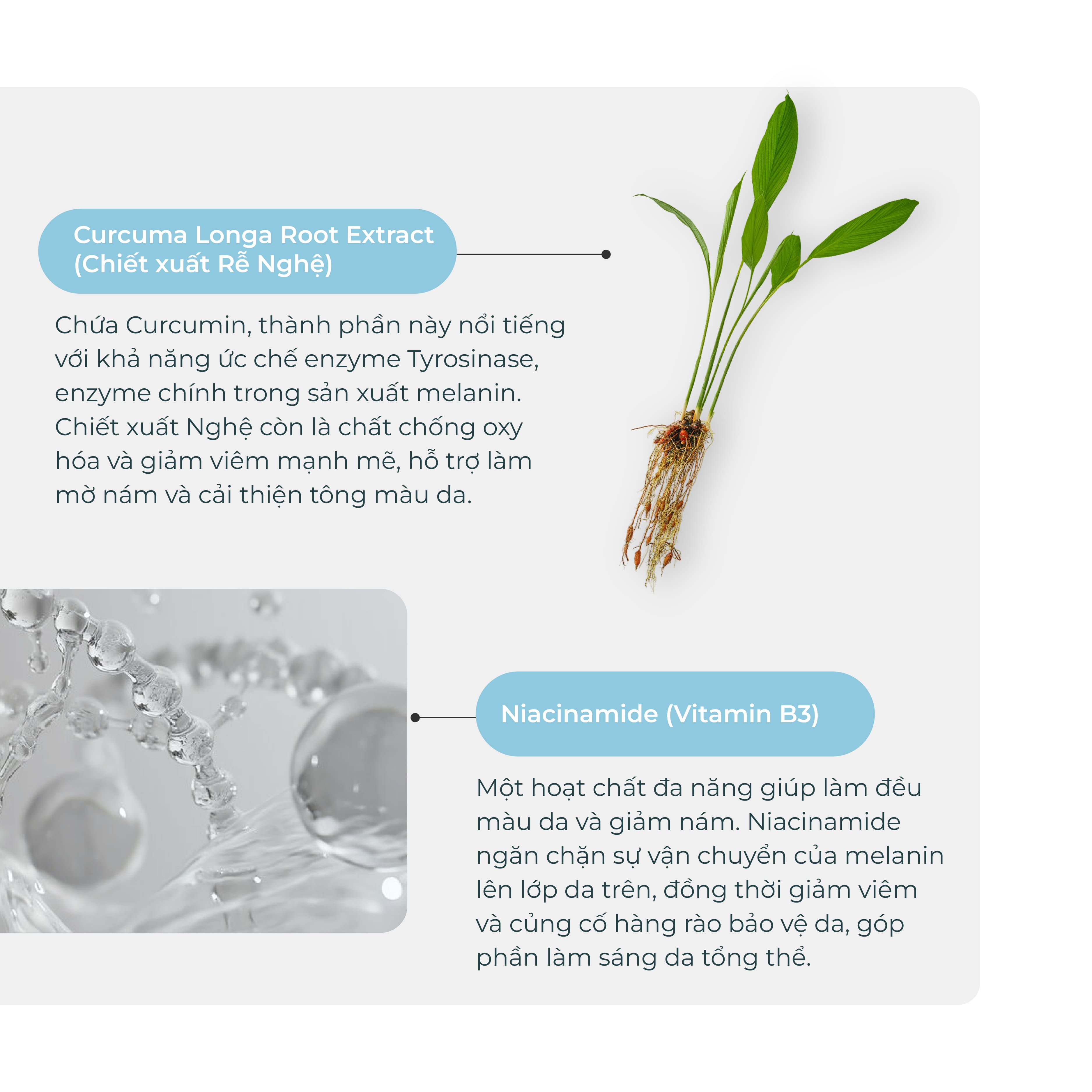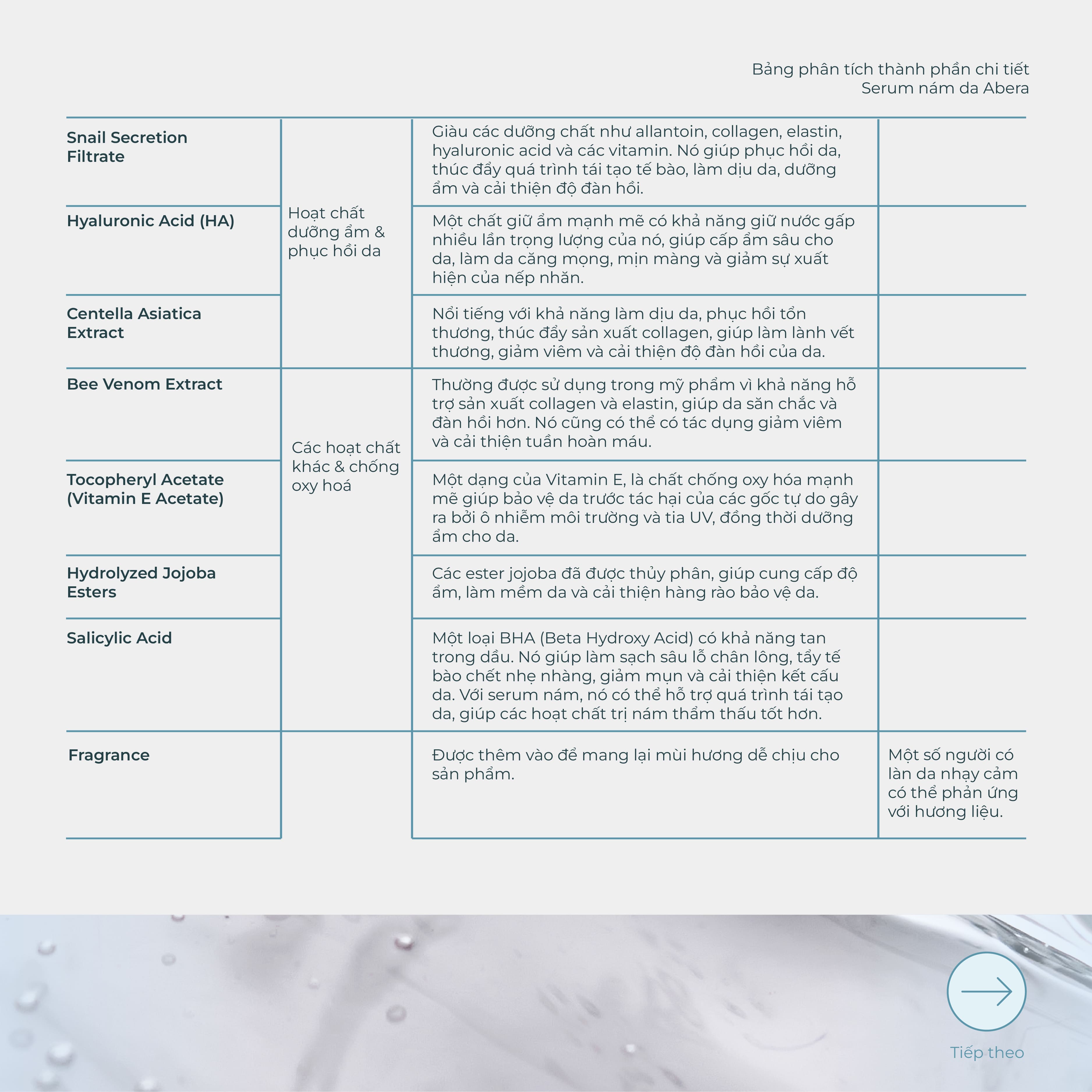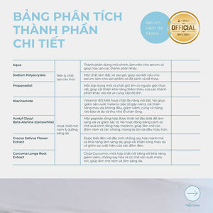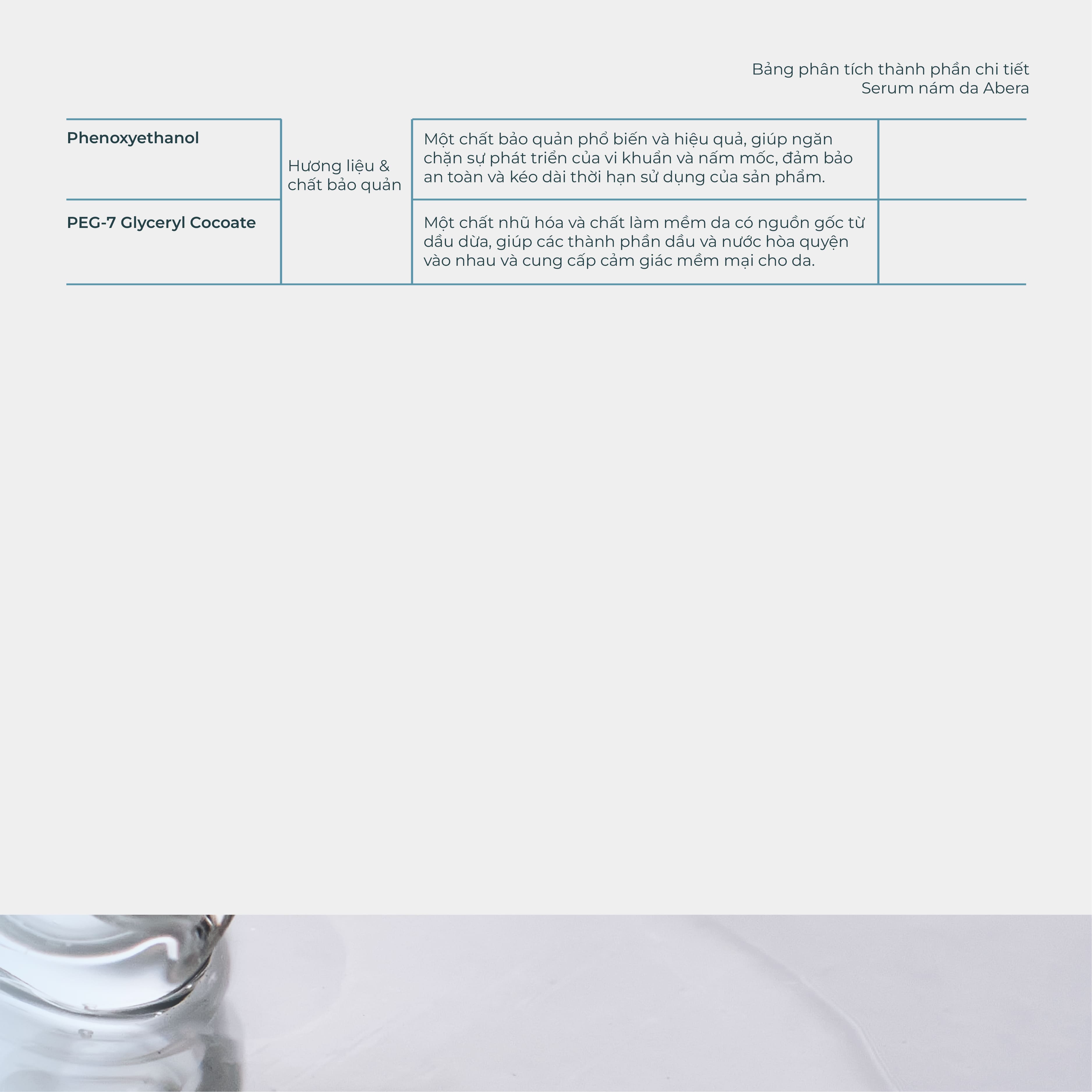 Abera Melasma Serum contains many natural ingredients, such as Corn extract and Saffron flower, and advanced active ingredients, such as Genowhite and Niacinamide, to help effectively prevent signs of skin ageing.