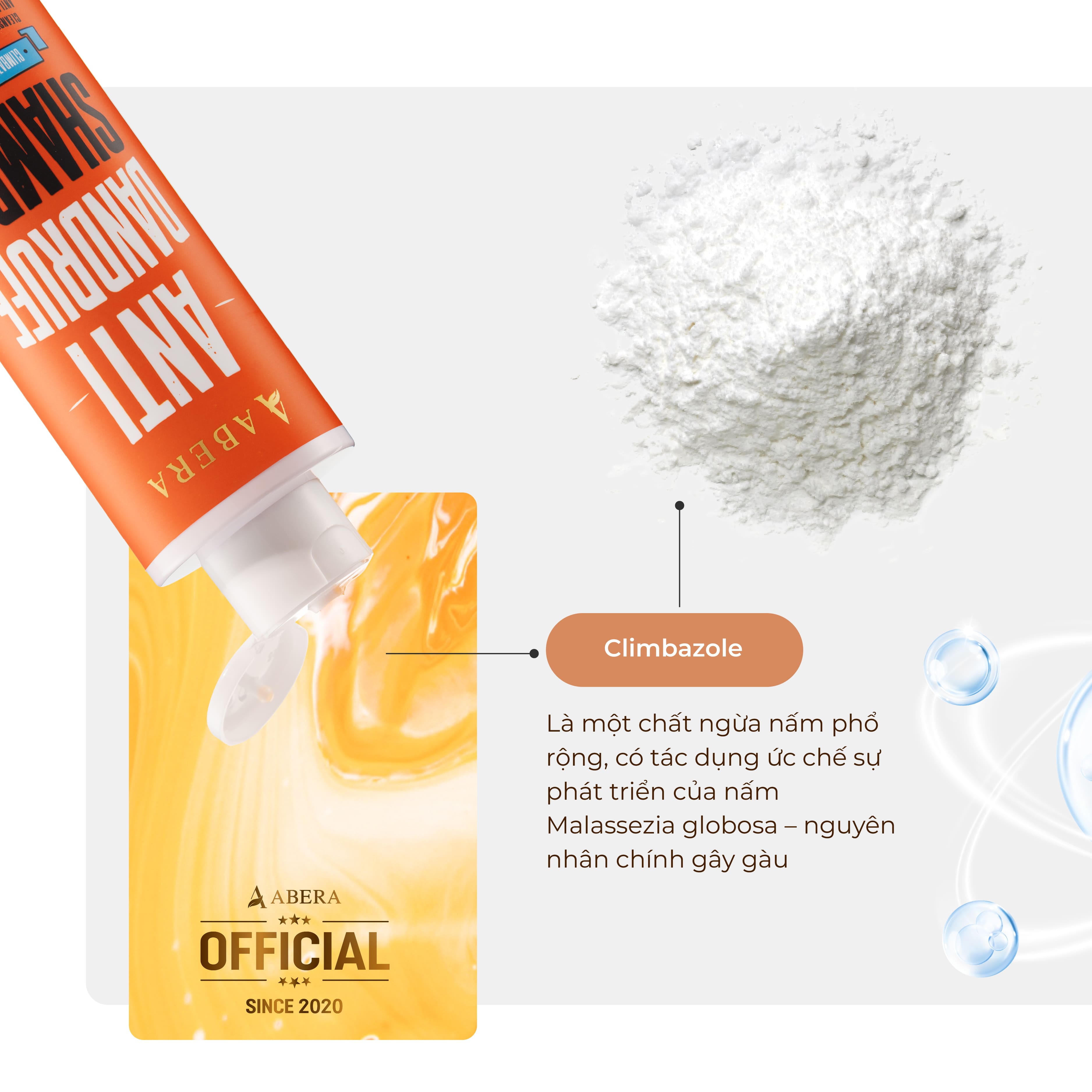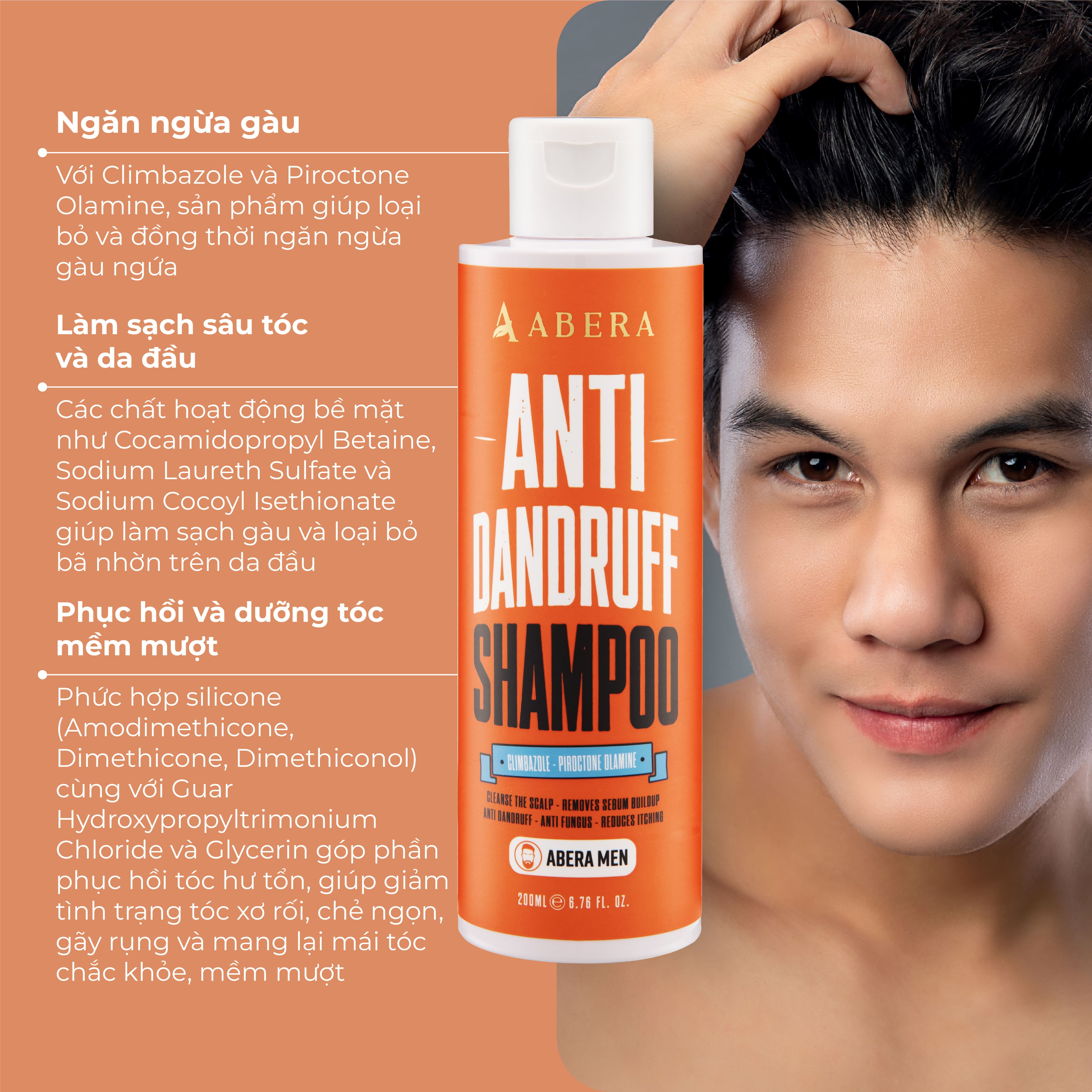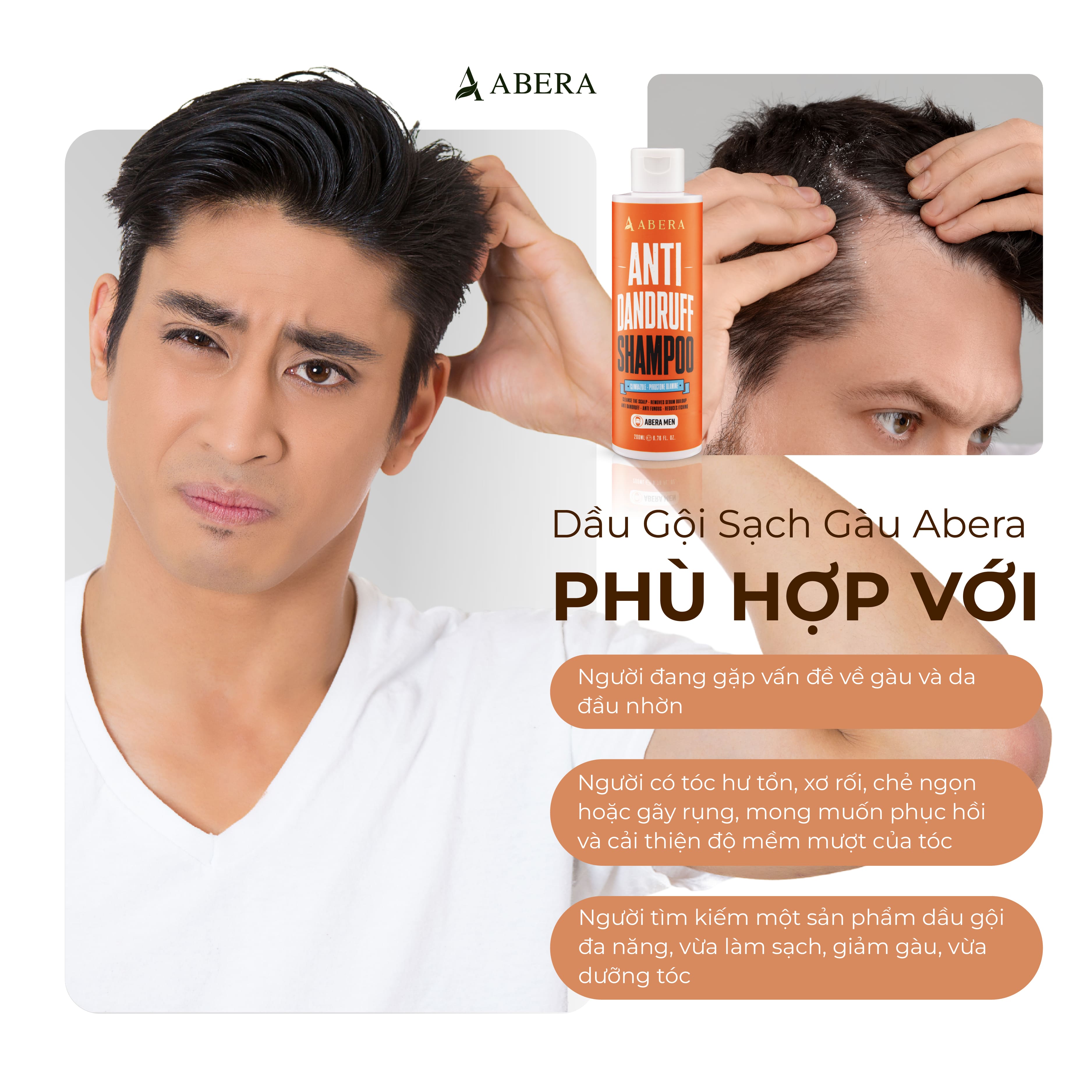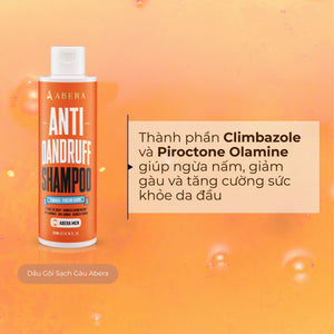 Dầu Gội Sạch Gàu Abera Men chứa các thành phần hỗ trợ làm sạch gàu, ngăn ngừa nấm da đầu như Climbazole, Pirotone Plamine, chiết xuất cây xô thơm, chiết xuất cây tầm ma, phù hợp cho những ai đang gặp vấn đề với tình trạng gàu mảng/ nấm ngứa dai dẳng.