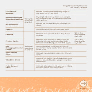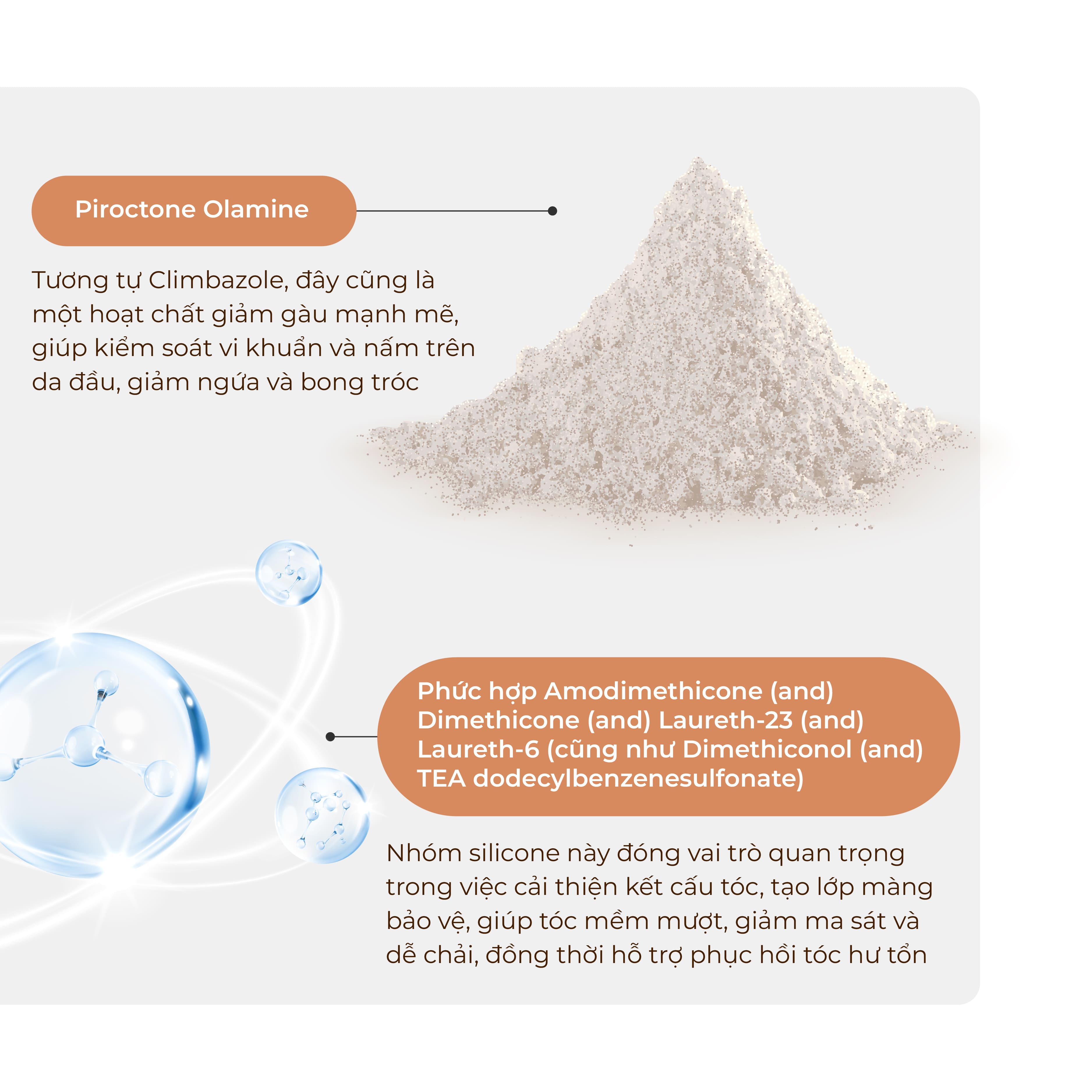 - Piroctone Olamine: Là hoạt chất hỗ trợ làm sạch gàu, giảm ngứa tiên tiến, lành tính cho hầu hết các loại da đầu.