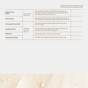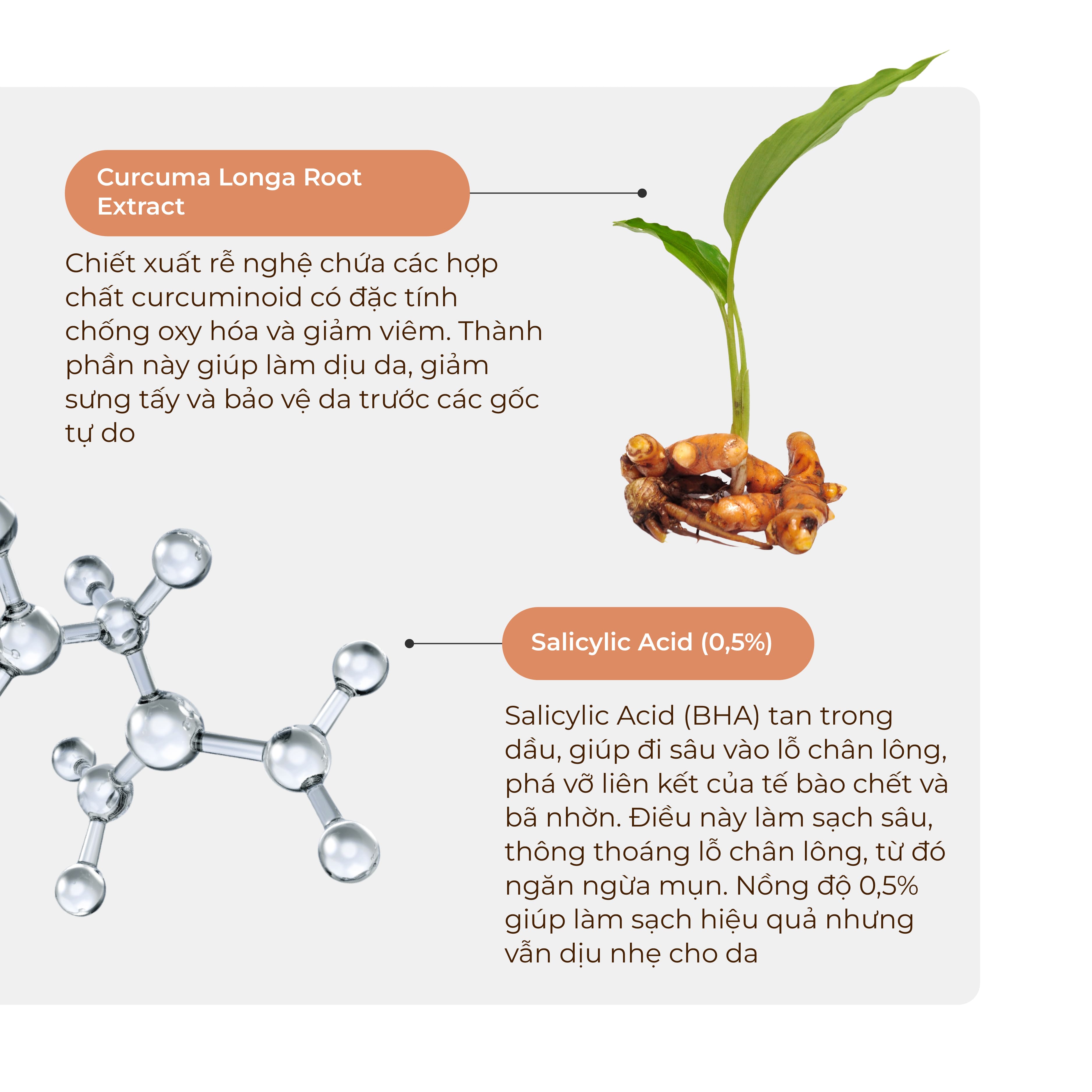 - Salicylic Acid 0,5%: Một loại BHA có khả năng hòa tan trong dầu, hoạt động bằng cách thâm nhập sâu vào các nang lông, phá vỡ liên kết giữa các tế bào da chết và bã nhờn. Quá trình này giúp làm sạch hiệu quả, giữ cho lỗ chân lông thông thoáng và hỗ trợ ngăn ngừa mụn. Nồng độ 0,5% giúp làm sạch mạnh mẽ nhưng vẫn nhẹ nhàng, không gây kích ứng cho da.