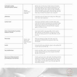 - Lactic Acid/ Sodium Lactate: Làm mất cân bằng vi sinh của các vi khuẩn gây bệnh và nấm âm đạo, đồng thời thúc đẩy lợi khuẩn phát triển, duy trì sức khỏe của vùng kín.
