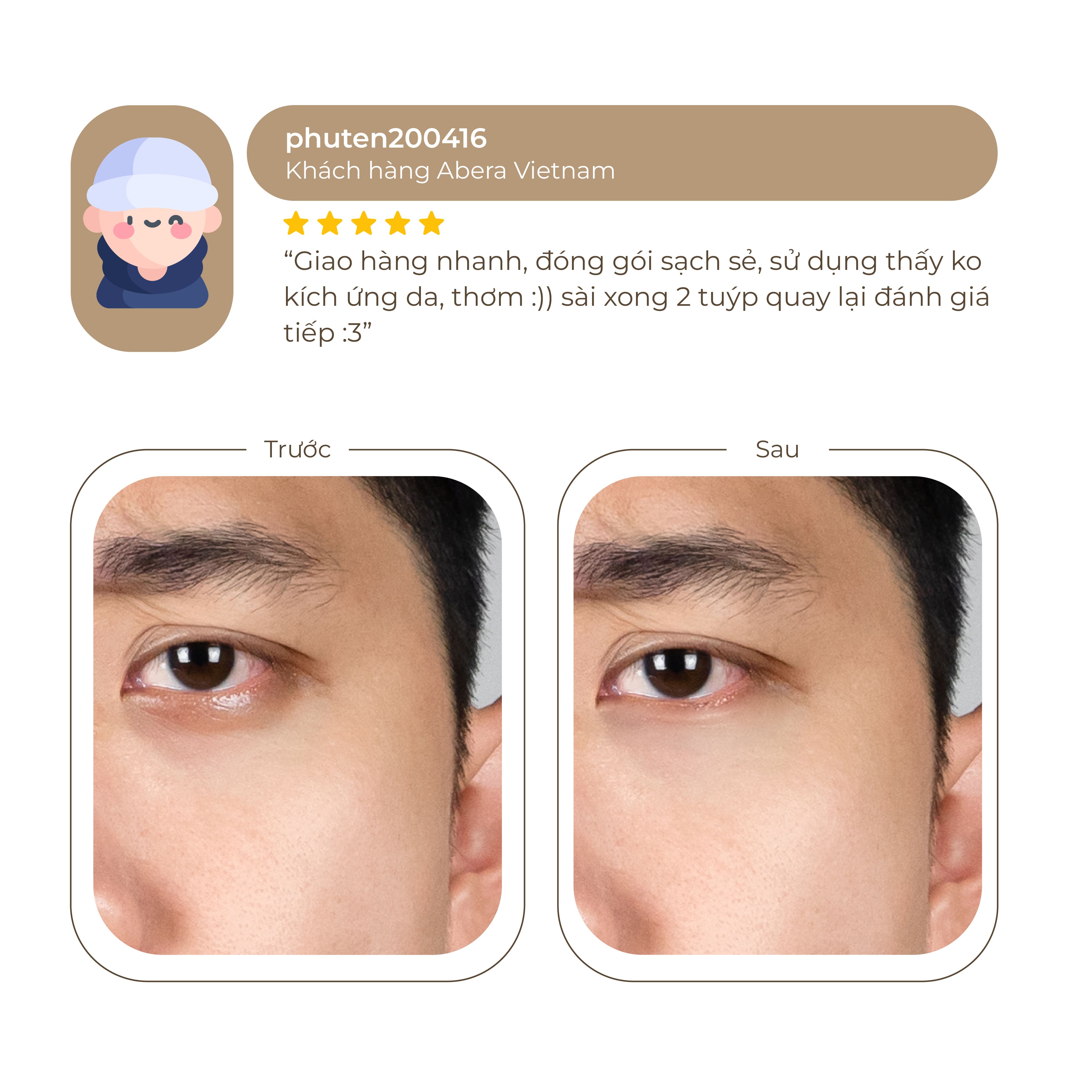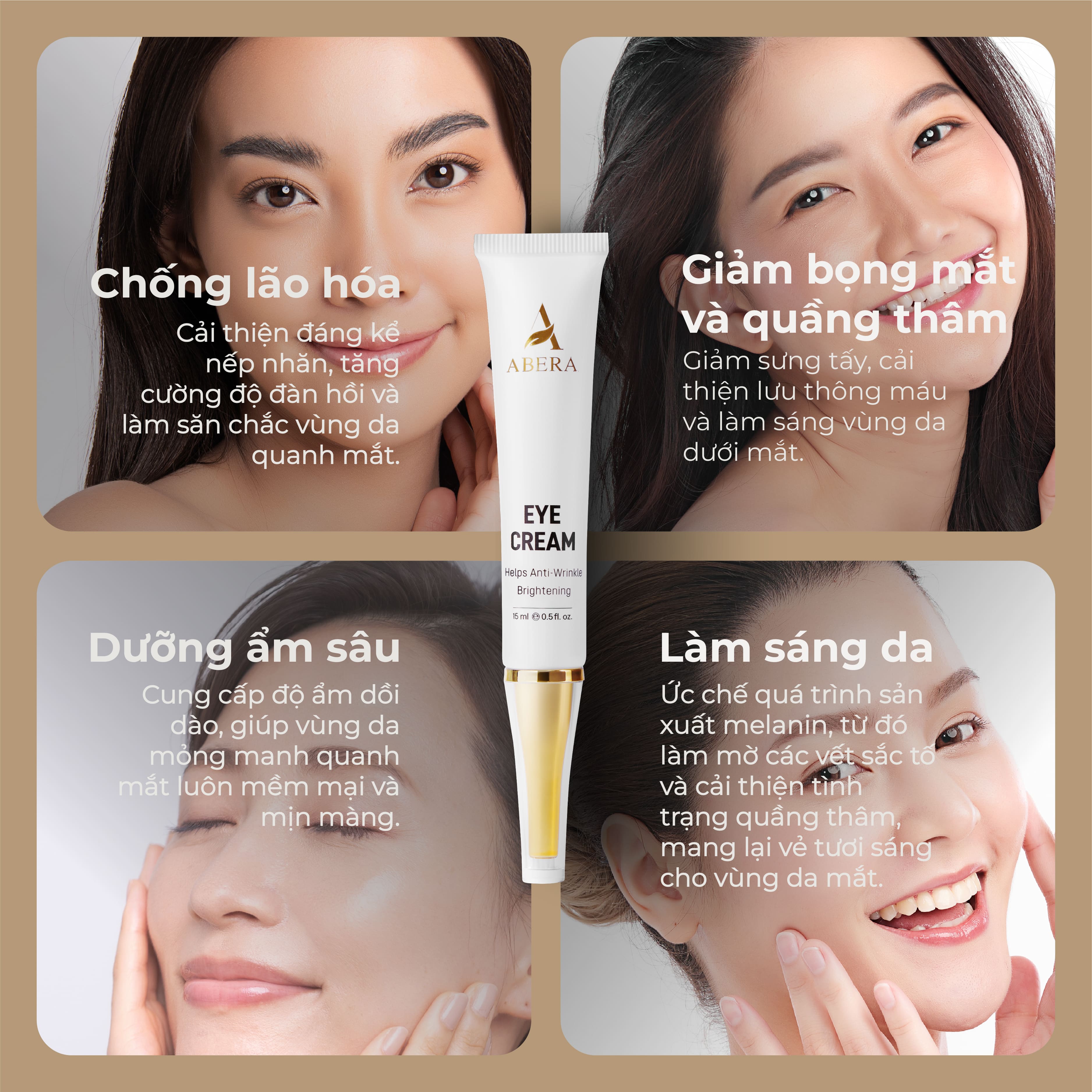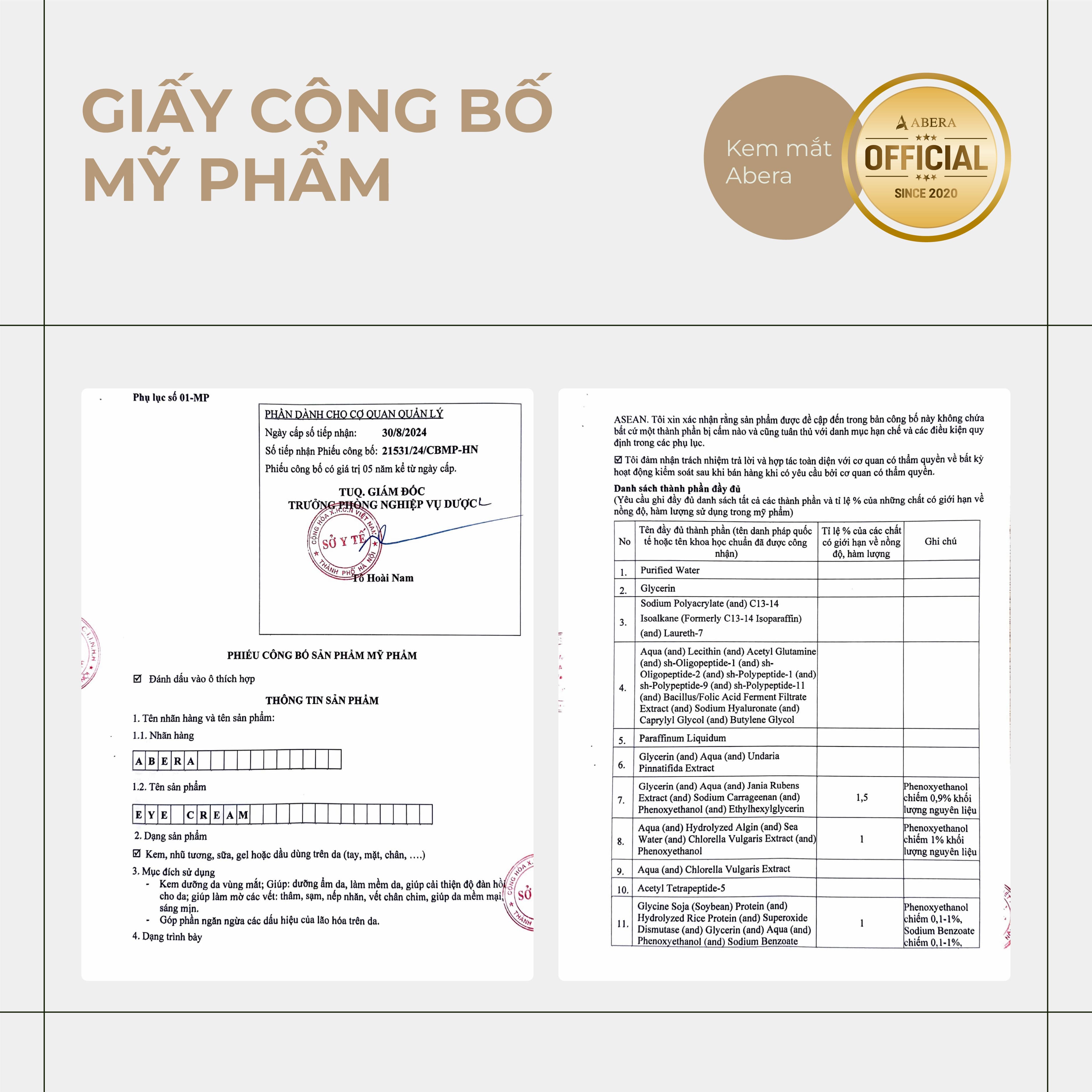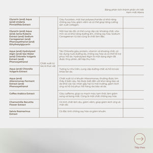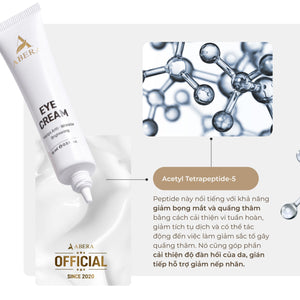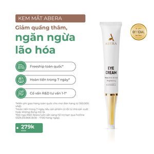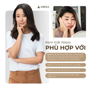 Kem Mắt Abera là sản phẩm dành cho những ai thường xuyên phải thức khuya để học tập, làm việc,... Kem Mắt Abera có công dụng làm mờ quầng thâm mắt và làm sáng vùng da quanh mắt, chỉ cần dùng từ 3-6 tuần là có thể cảm nhận sự khác biệt.