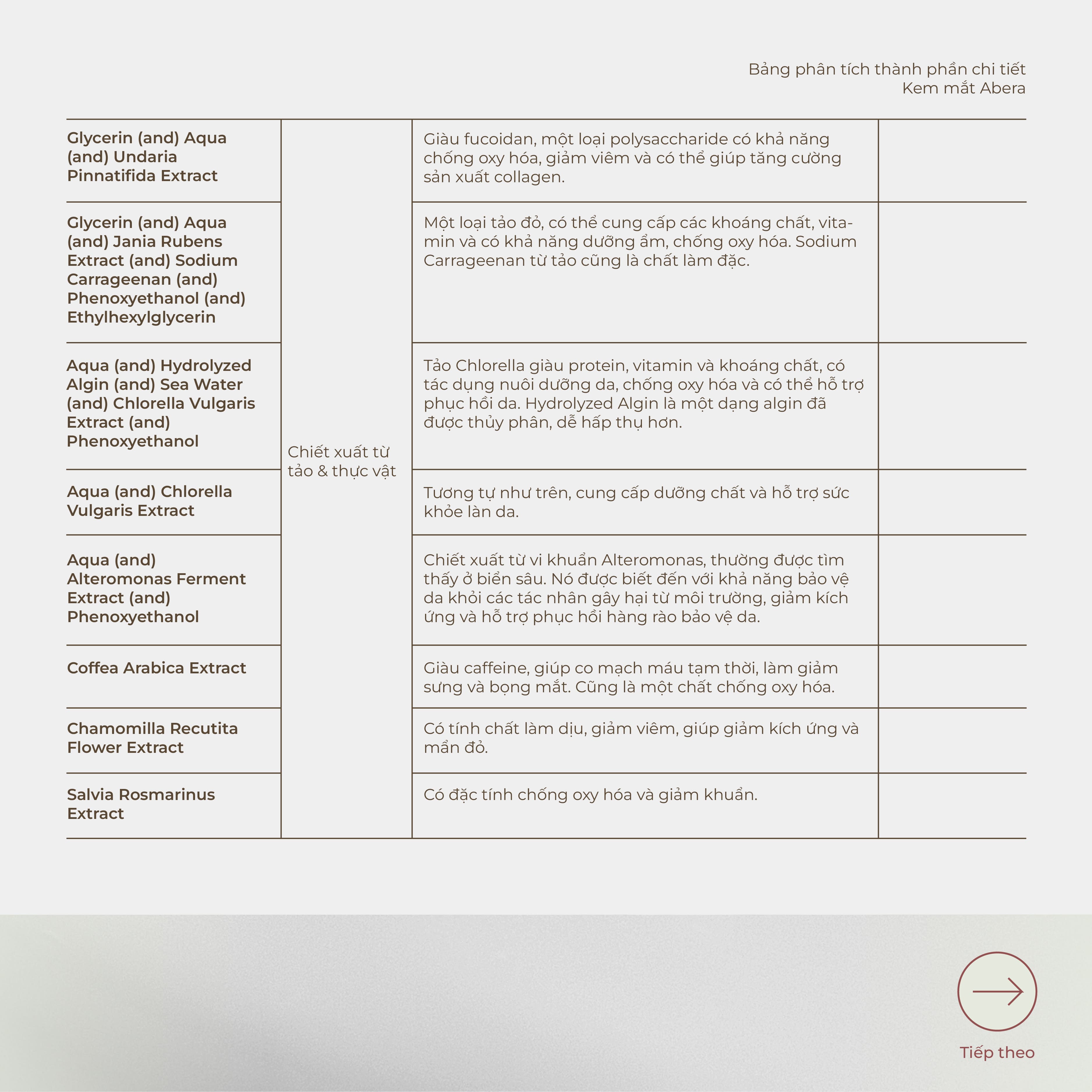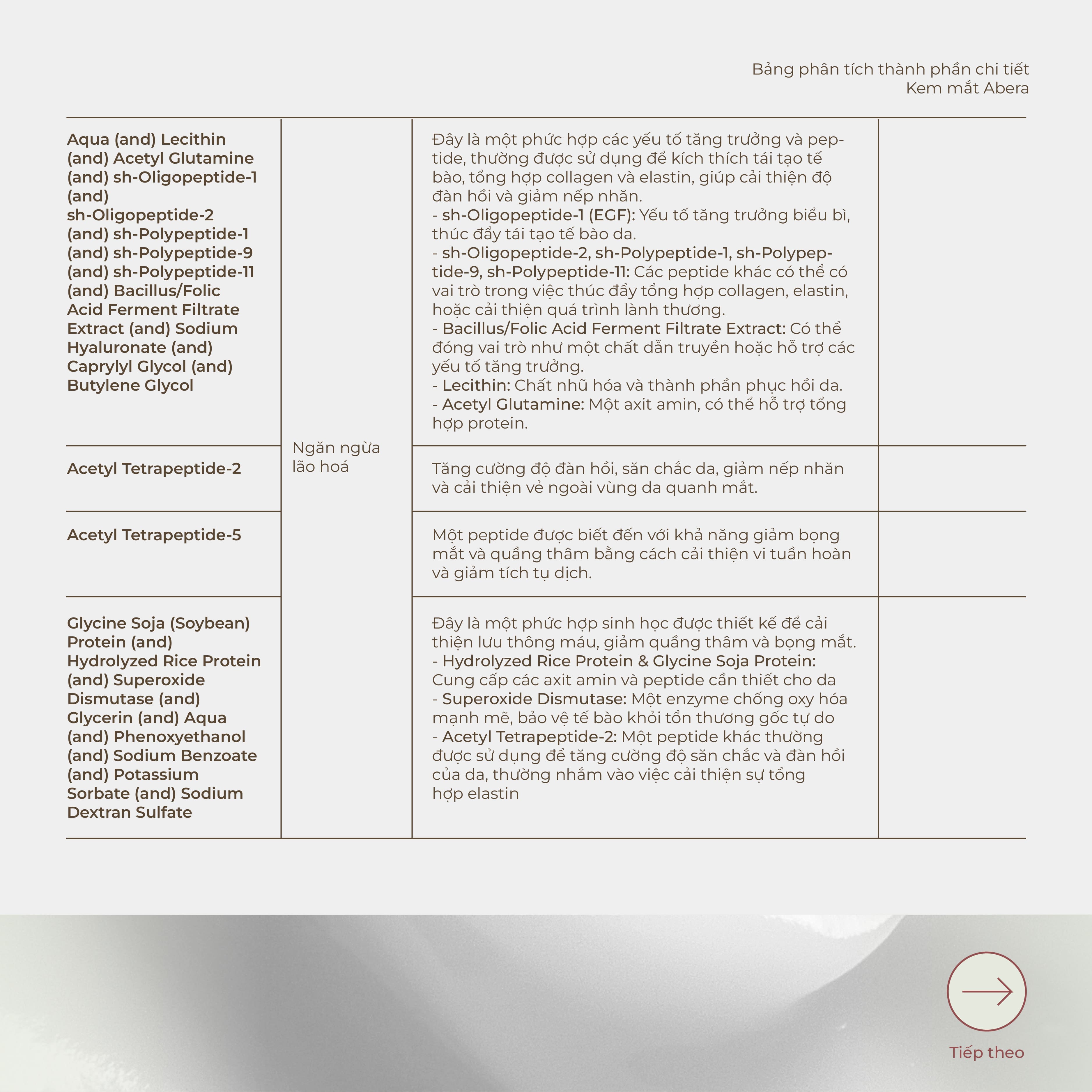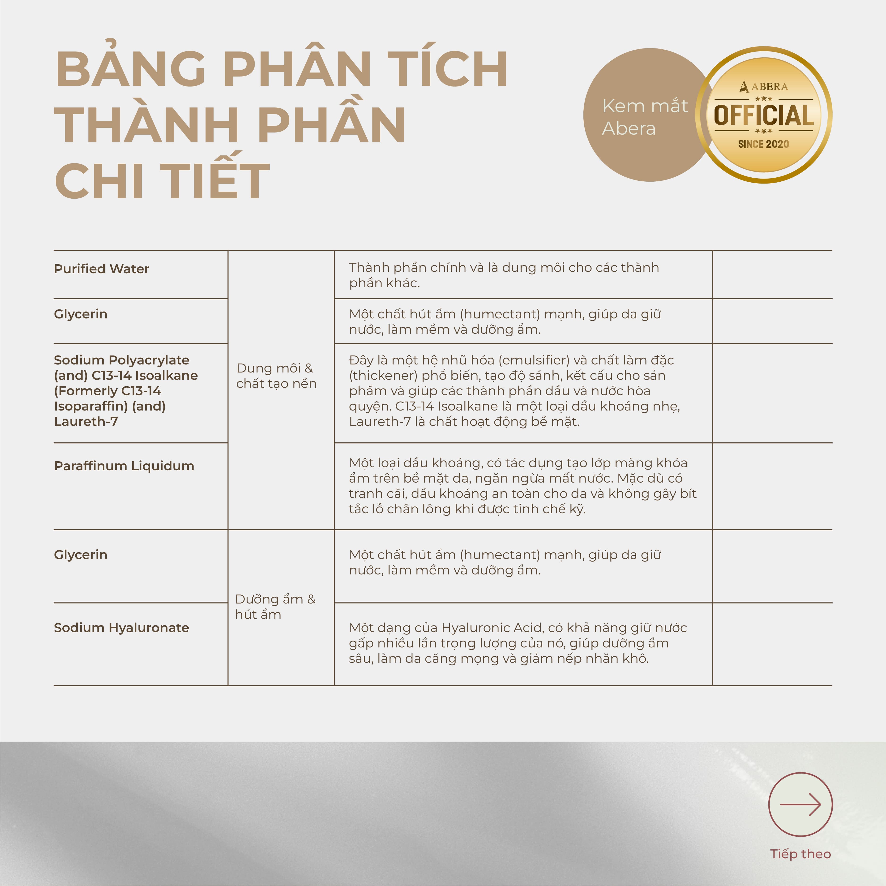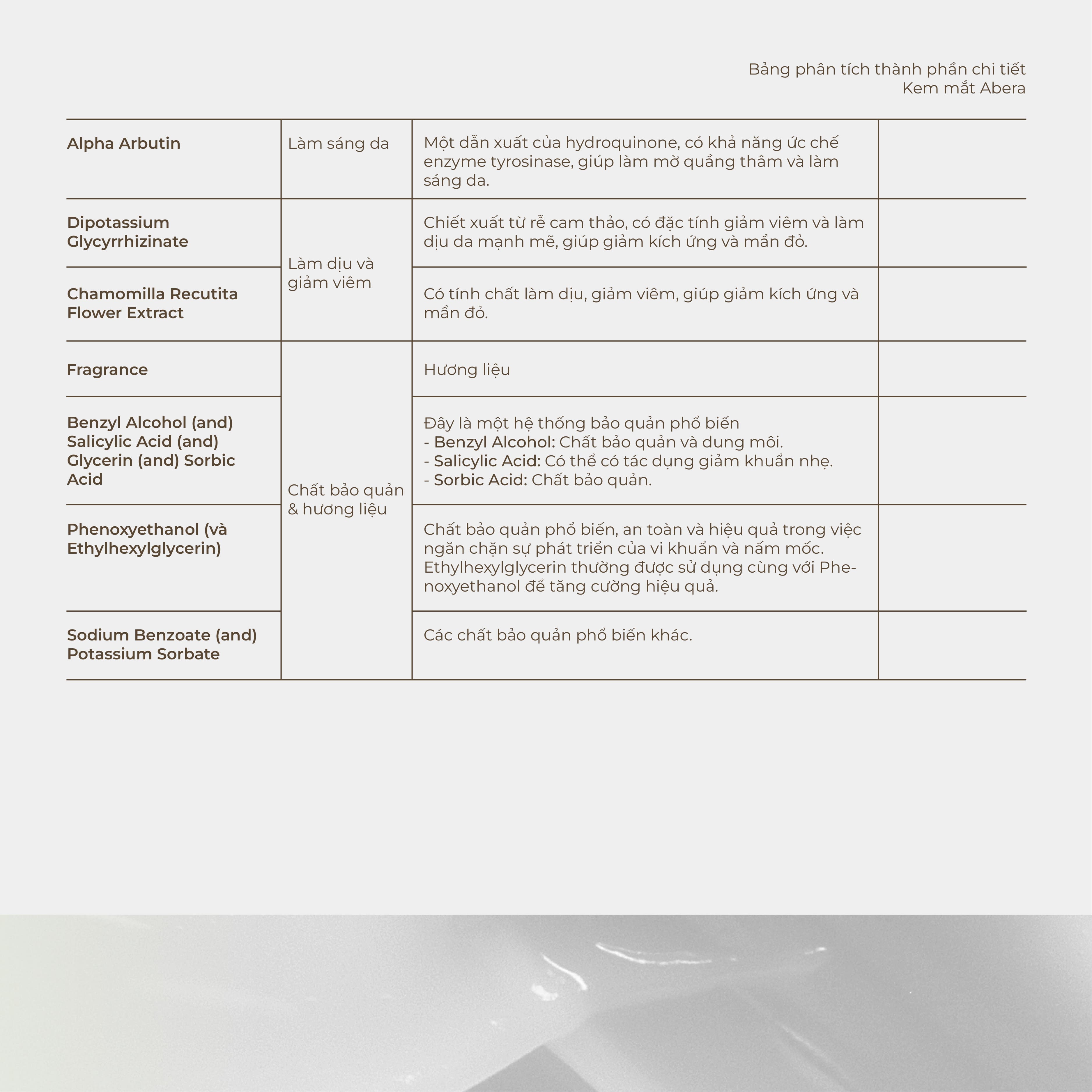 - Hydrolyzed Rice Protein: Giảm quầng thâm dưới mắt, bảo vệ và tăng cường làn da mỏng manh dưới mắt, cải thiện kết cấu da.