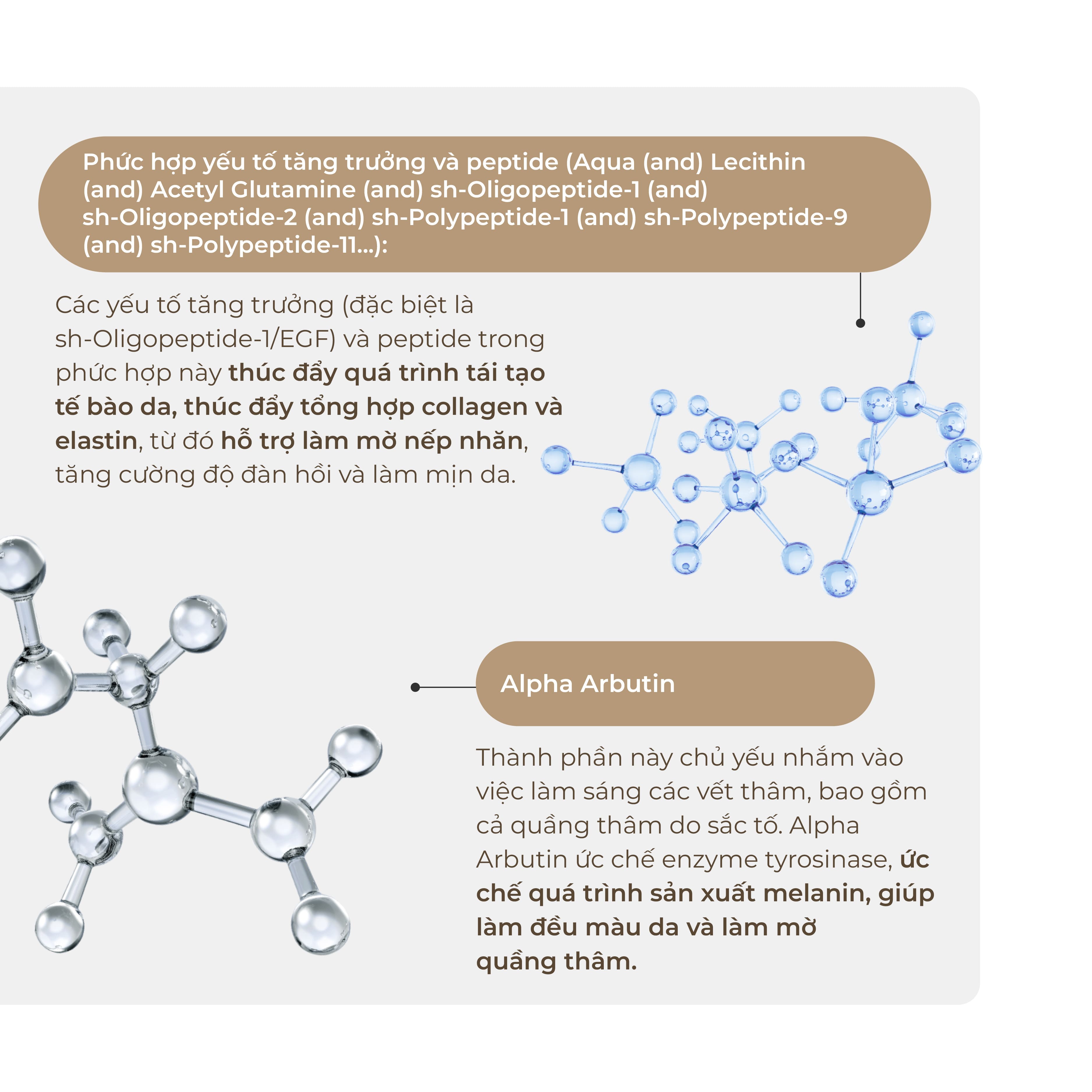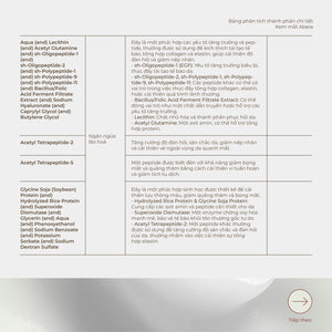 - Acetyl Tetrapeptide-5: Hiệp đồng tác dụng với Nhau thai sinh học Bio-Complex giúp tăng hiệu quả của nó trên da, đồng thời hỗ trợ Hydrolyzed Rice Protein phát huy tác dụng tốt hơn.
