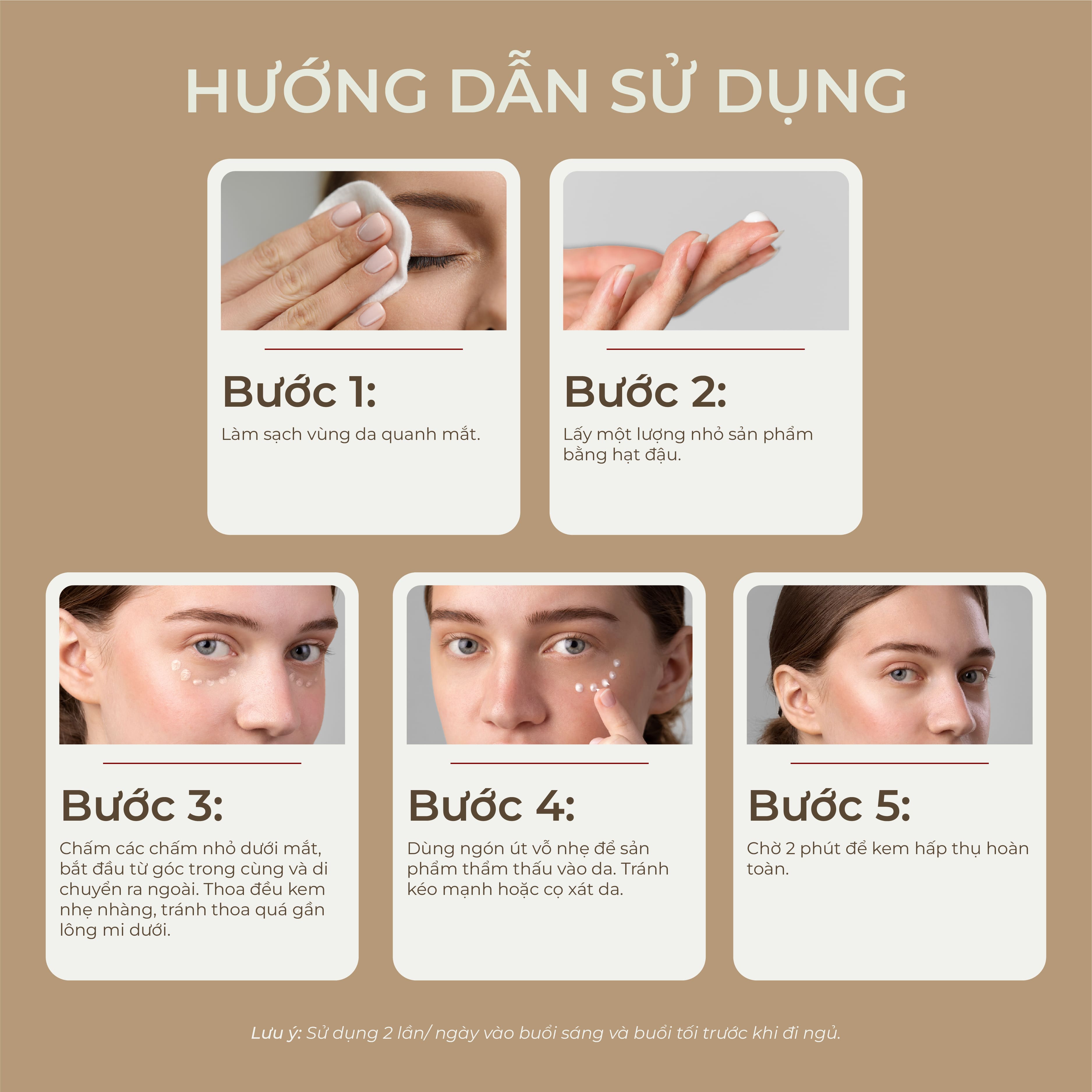Bước 3: Chấm các chấm nhỏ dưới mắt, bắt đầu từ góc trong cùng và di chuyển ra ngoài. Thoa đều kem nhẹ nhàng, tránh thoa quá gần lông mi dưới.