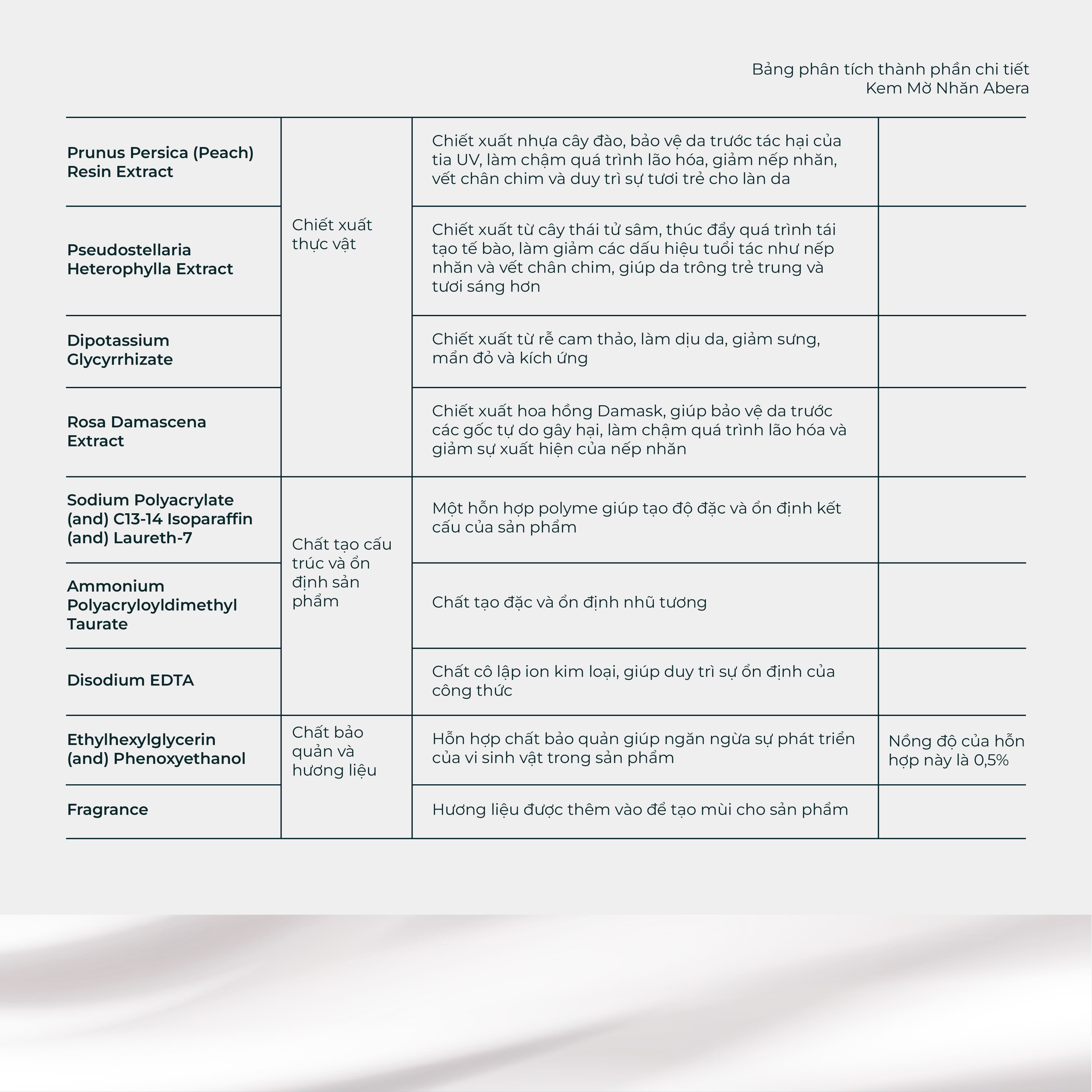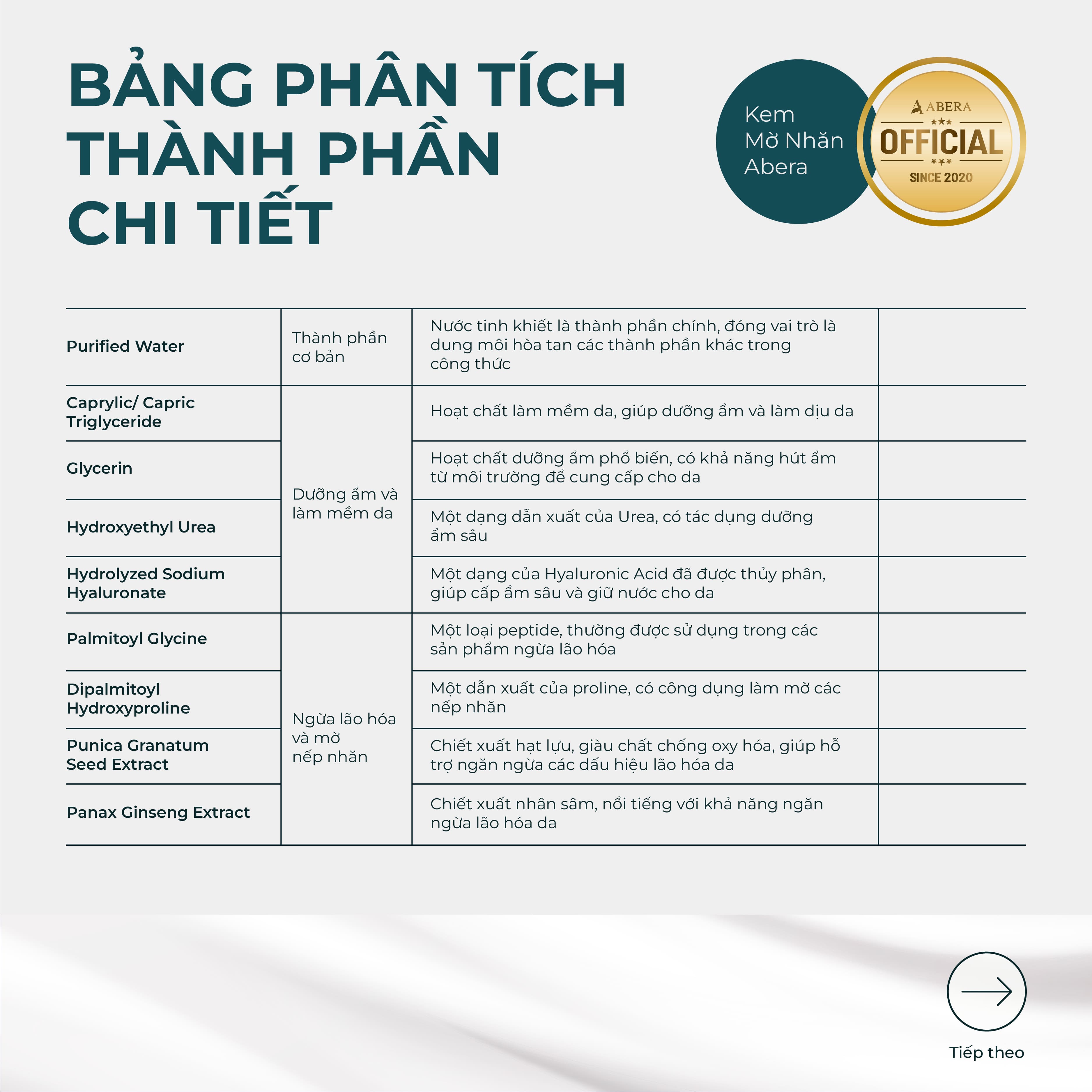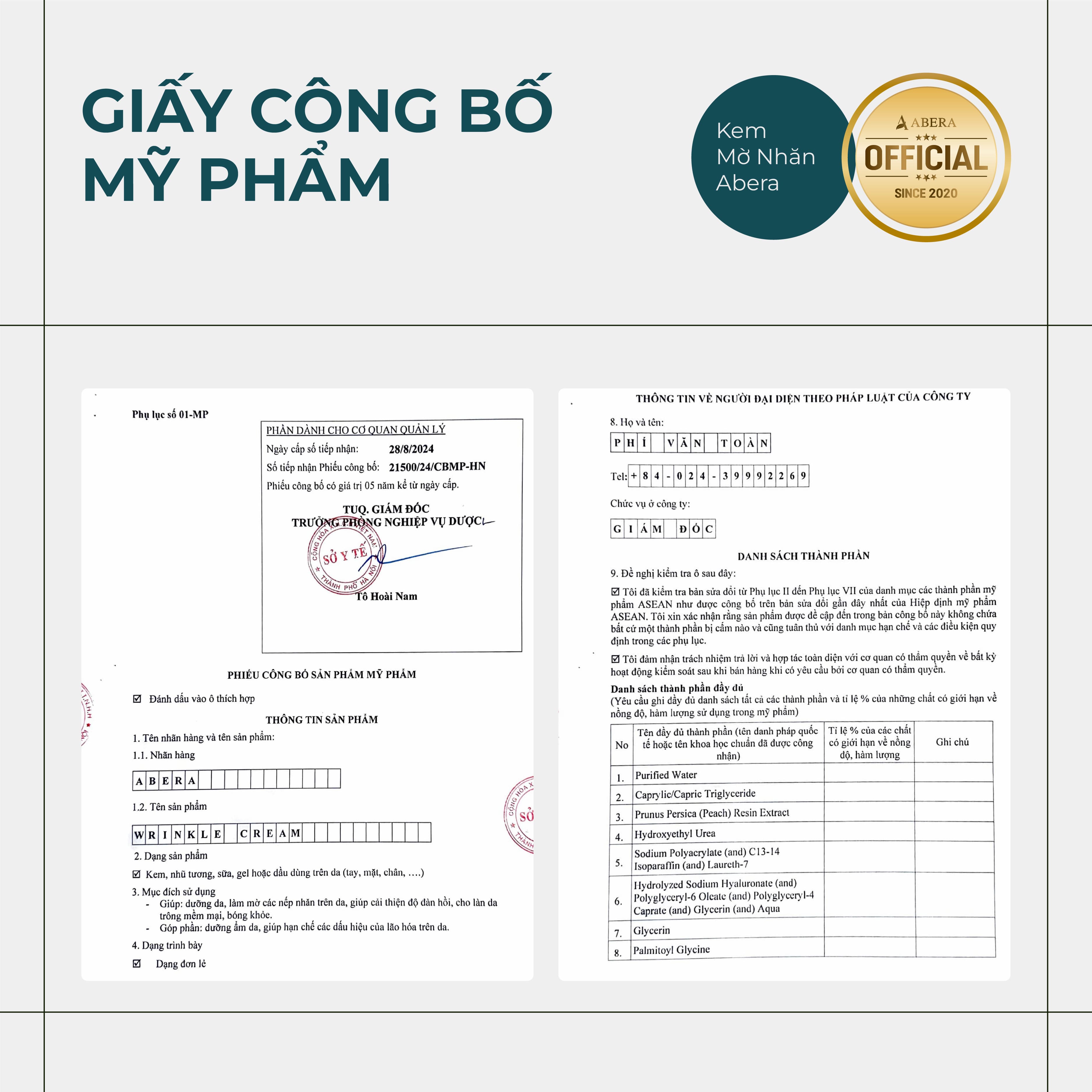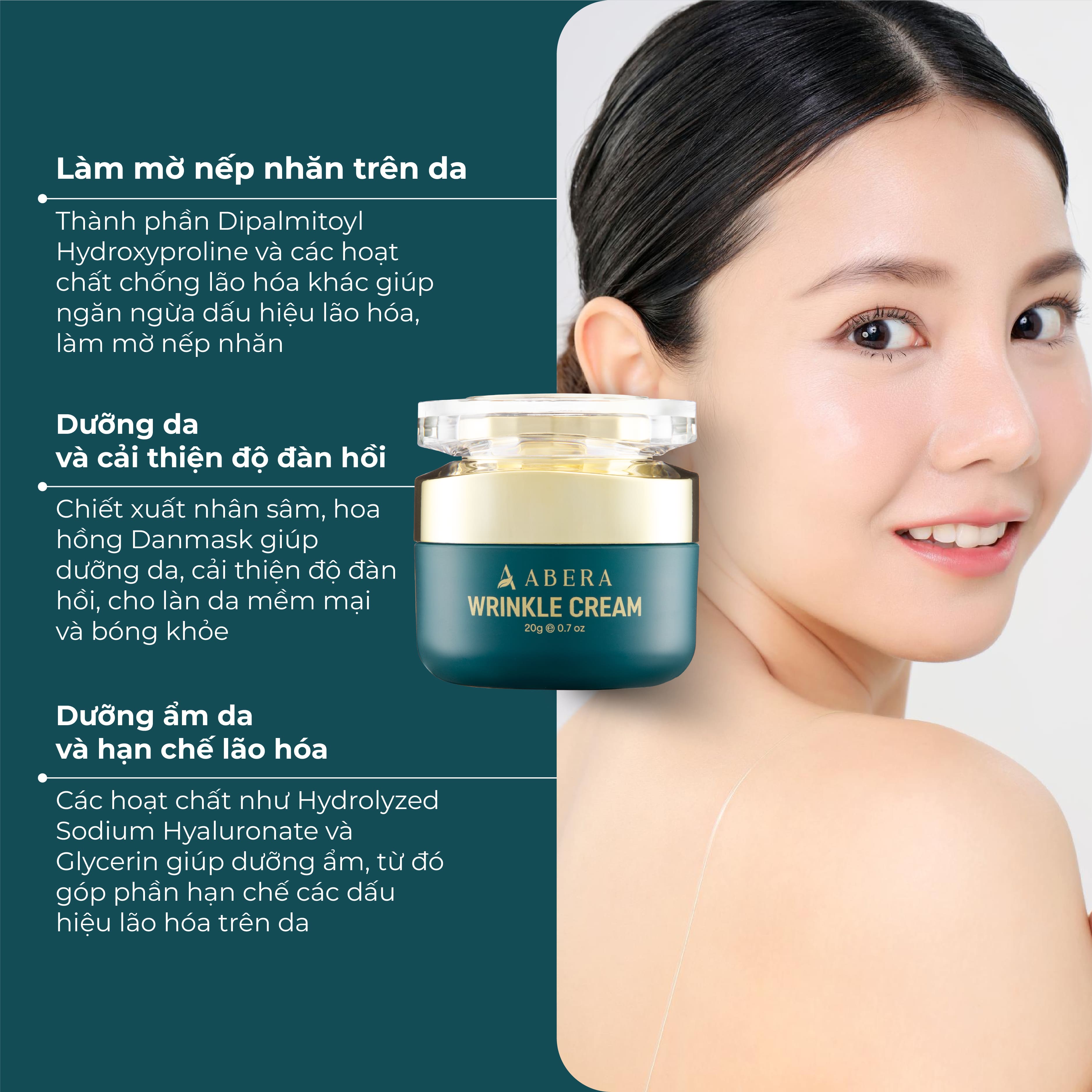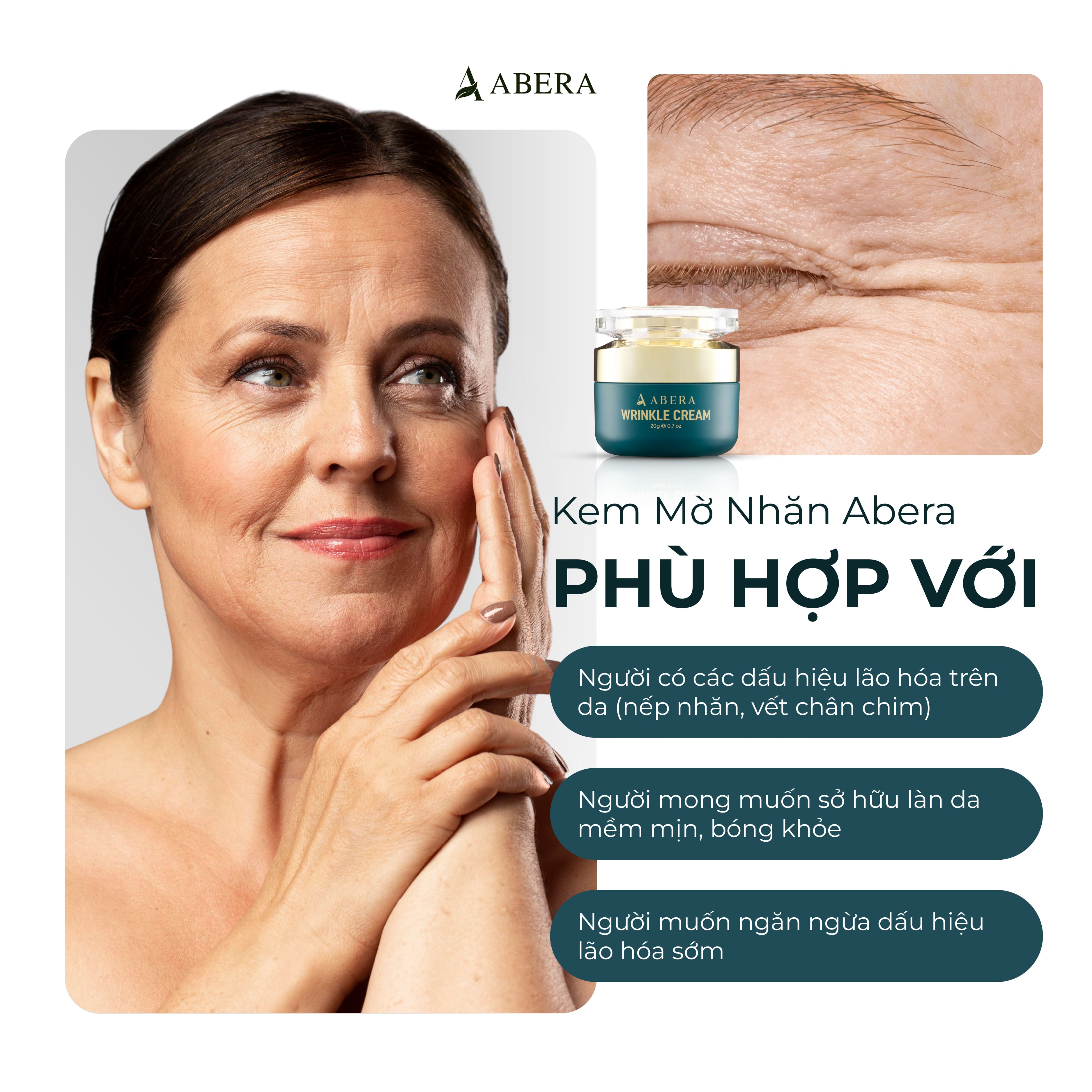 Kem Mờ Nhăn Abera là sản phẩm dành cho những chị em phụ nữ ở độ tuổi trung niên đang đau đầu vì vấn đề da nhăn, da chảy xệ. Kem Mờ Nhăn Abera có công dụng hỗ trợ thúc đẩy quá trình sản xuất collagen, tăng độ đàn hồi cho da và đồng thời bảo vệ da trước tia UV độc hại.