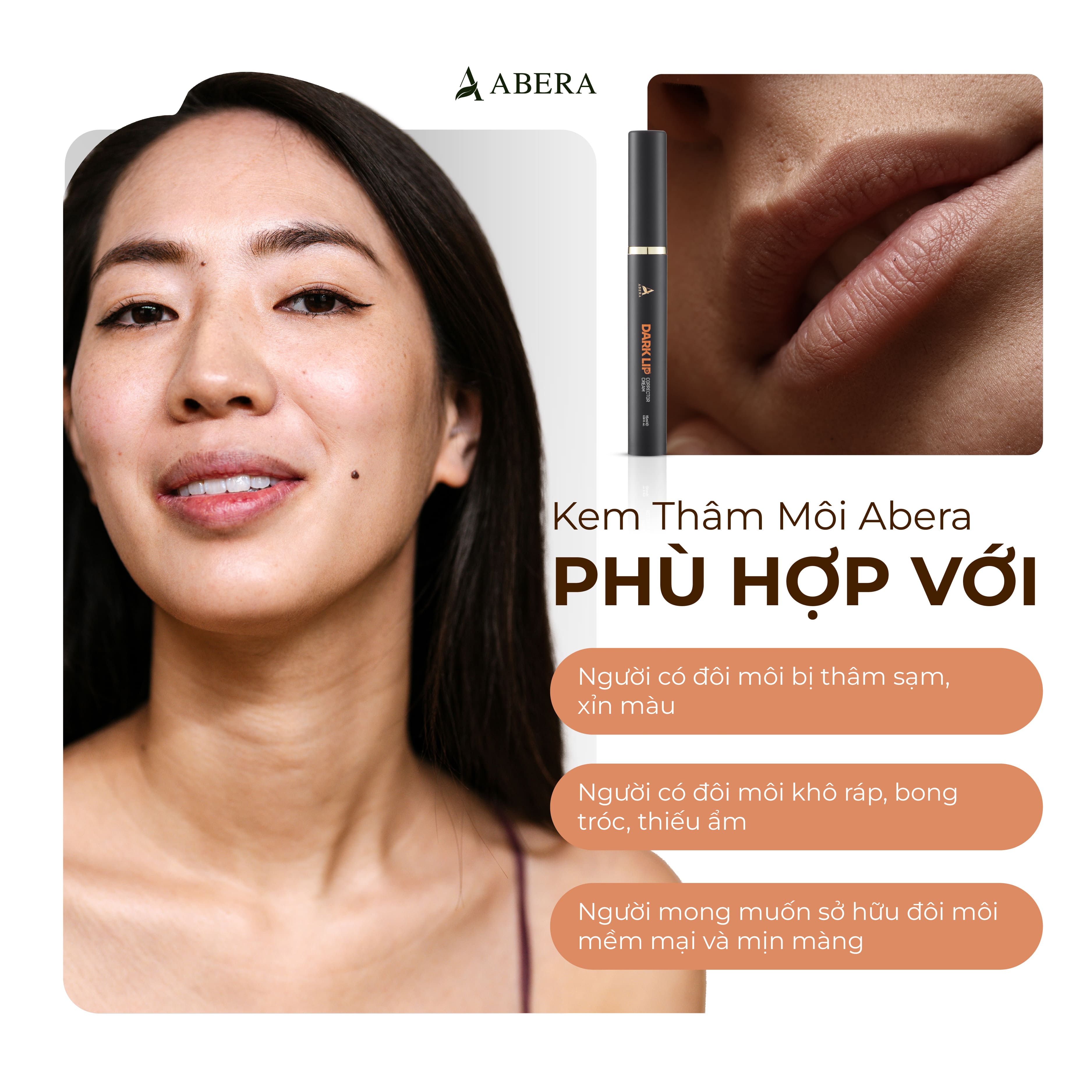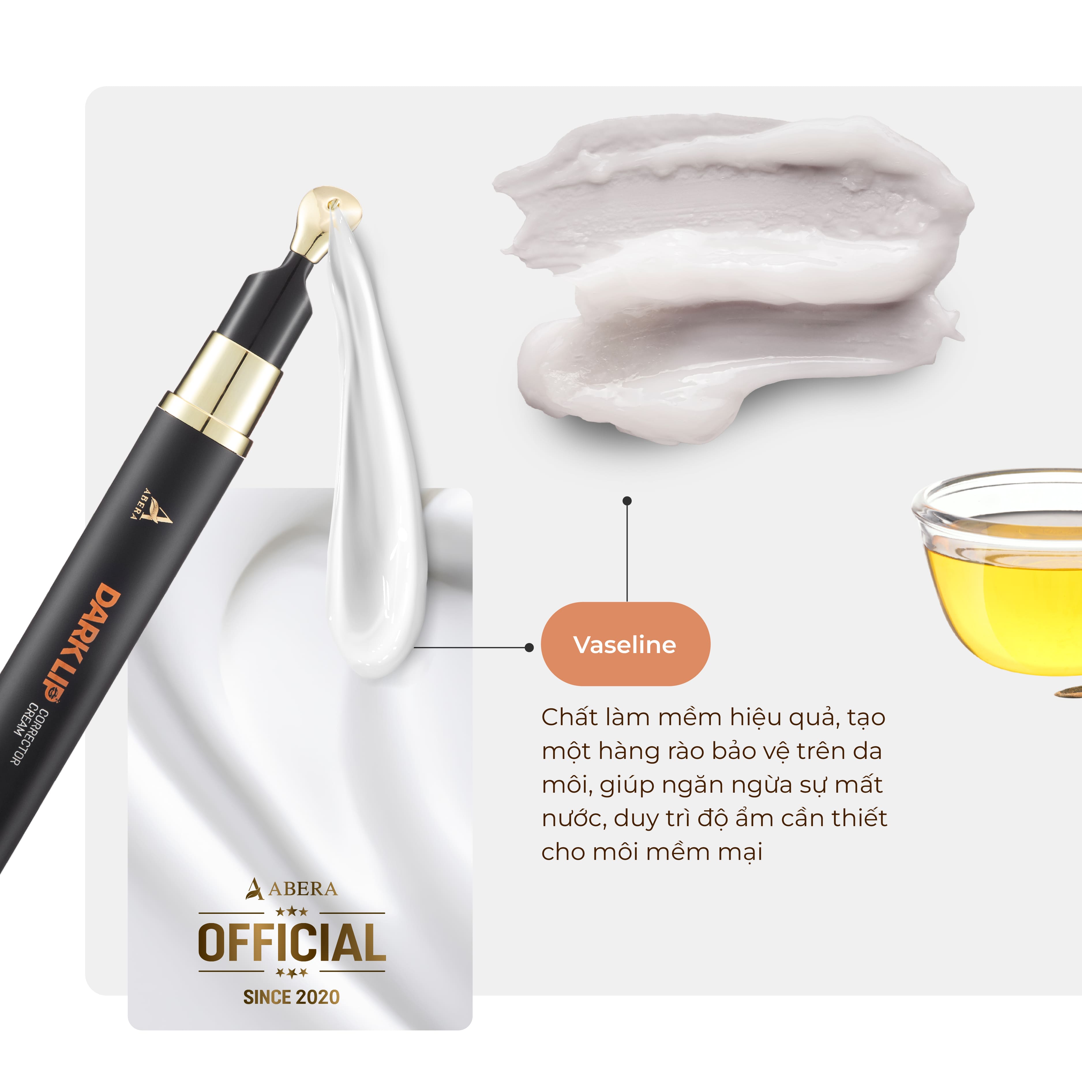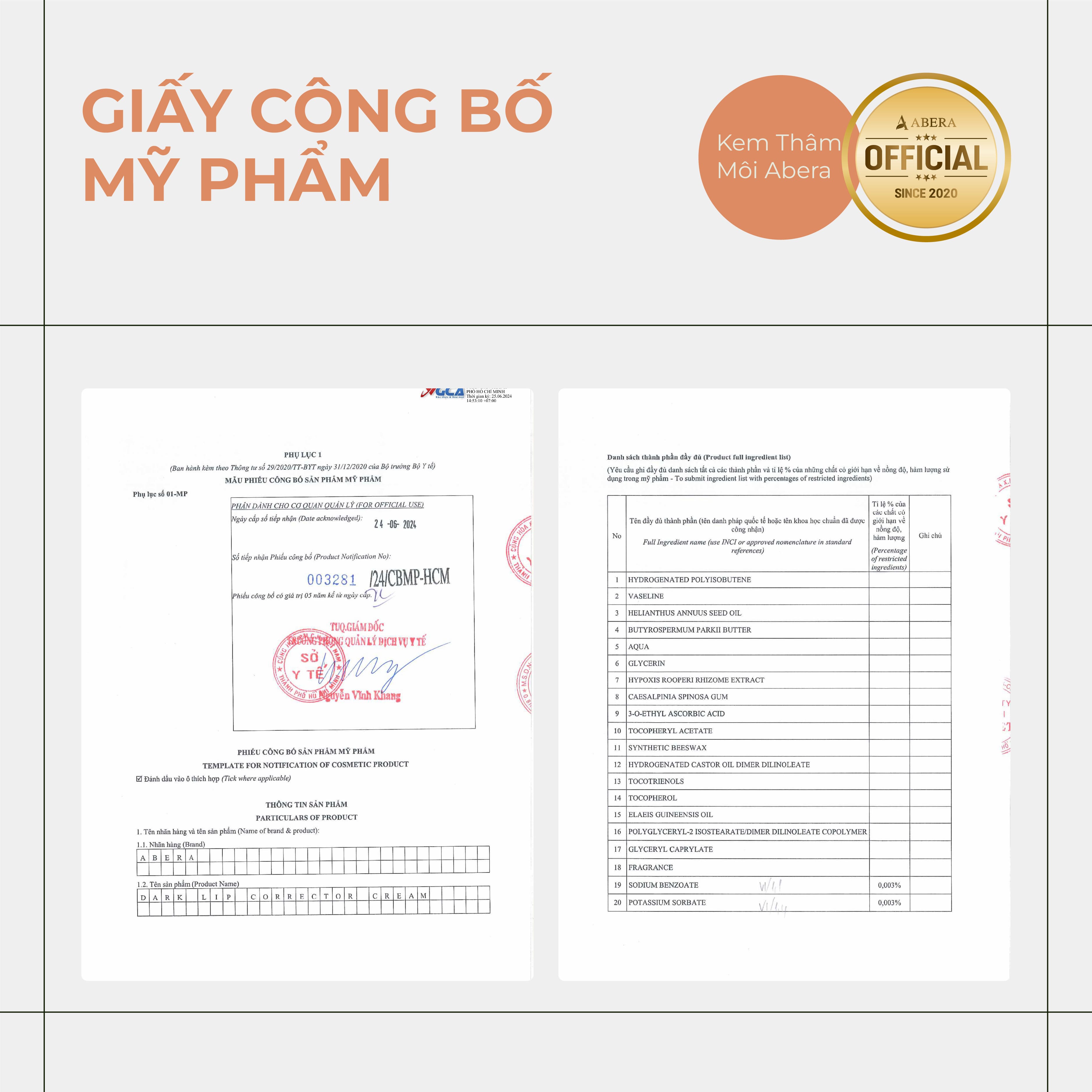 Kem Thâm Môi Abera là giải pháp hiệu quả cho những ai gặp vấn đề môi thâm, bong tróc, nứt nẻ. Sản phẩm chứa các thành phần giàu dưỡng chất như vaseline, vitamin C, sáp ong, có công dụng hỗ trợ cấp ẩm cho da môi, giảm thâm và làm hồng môi.