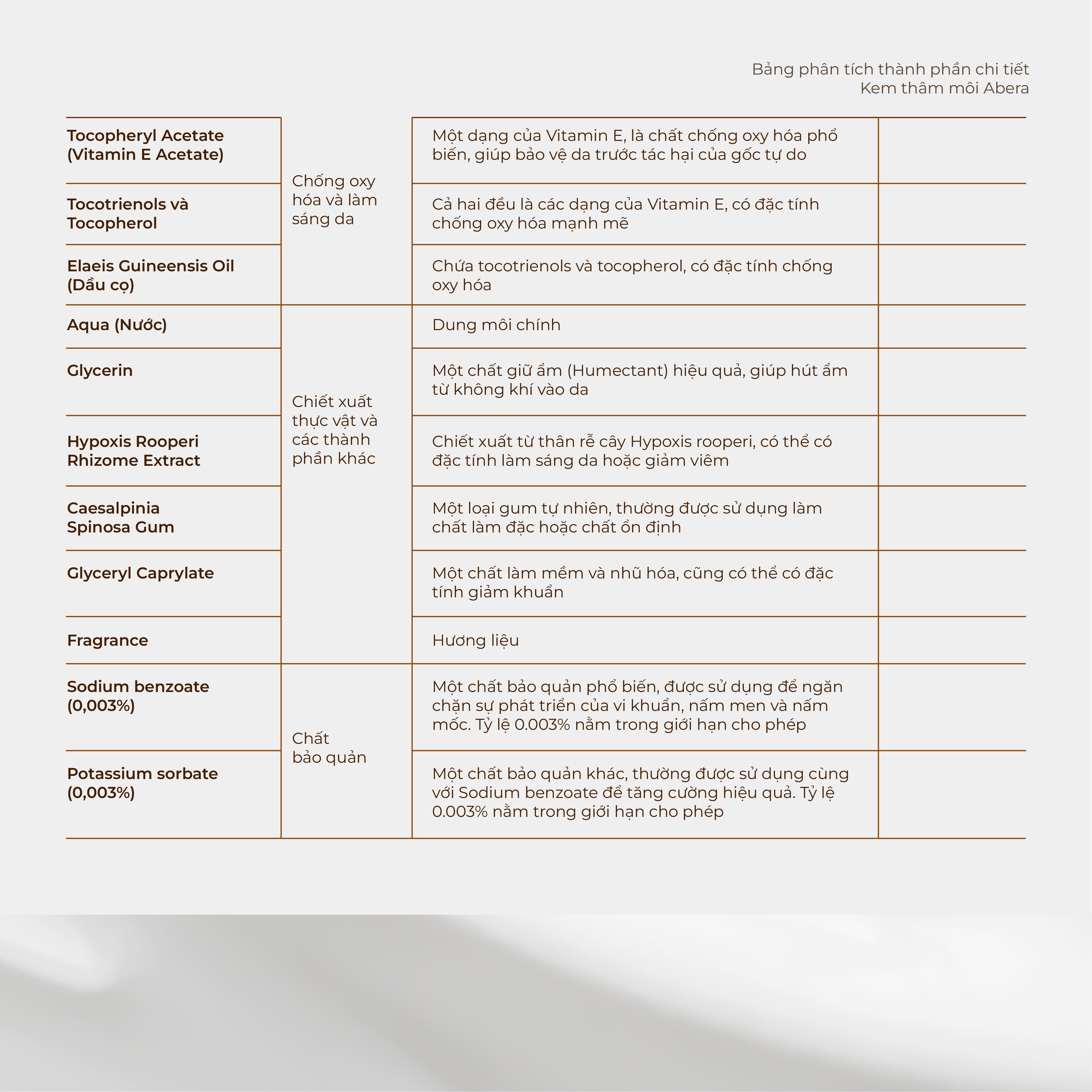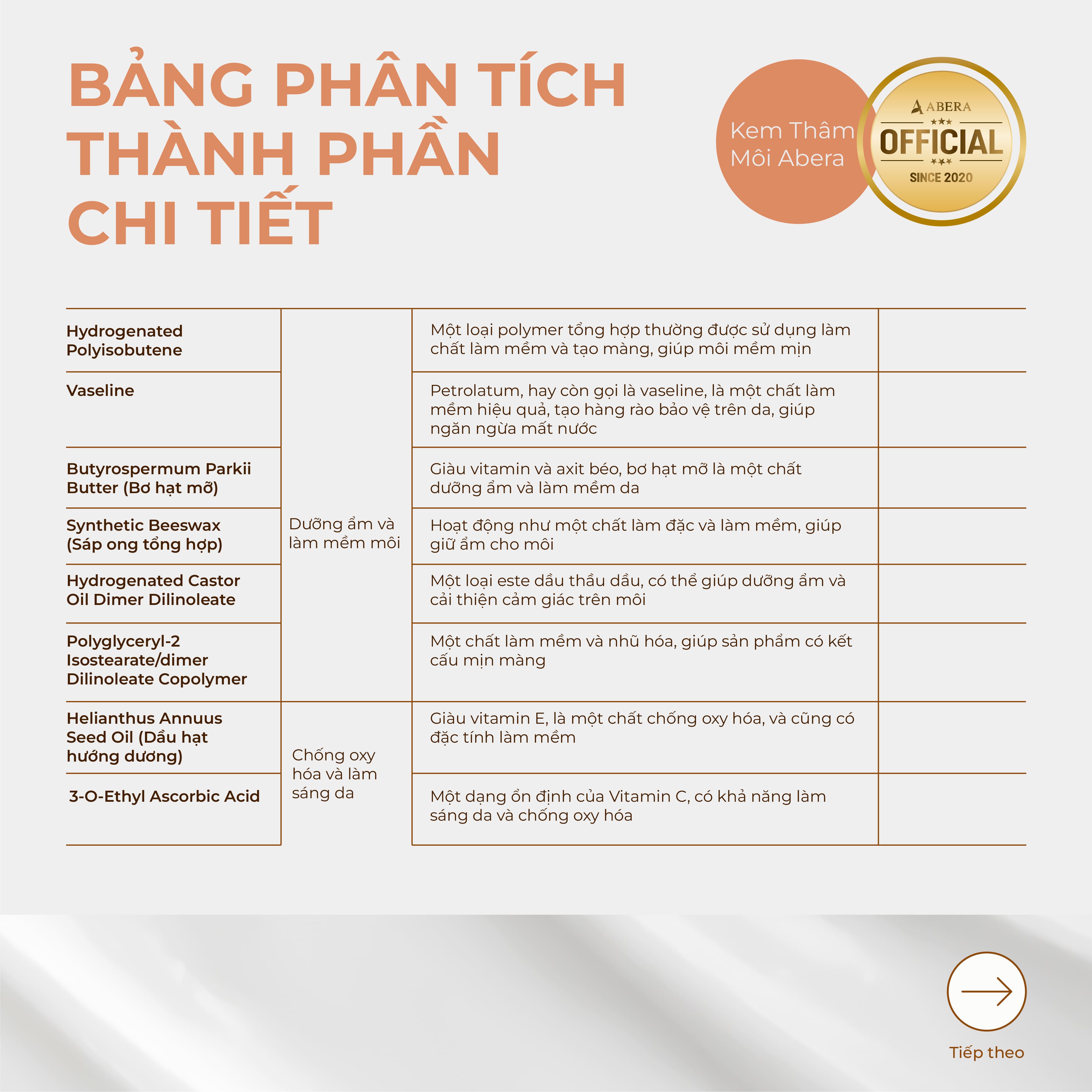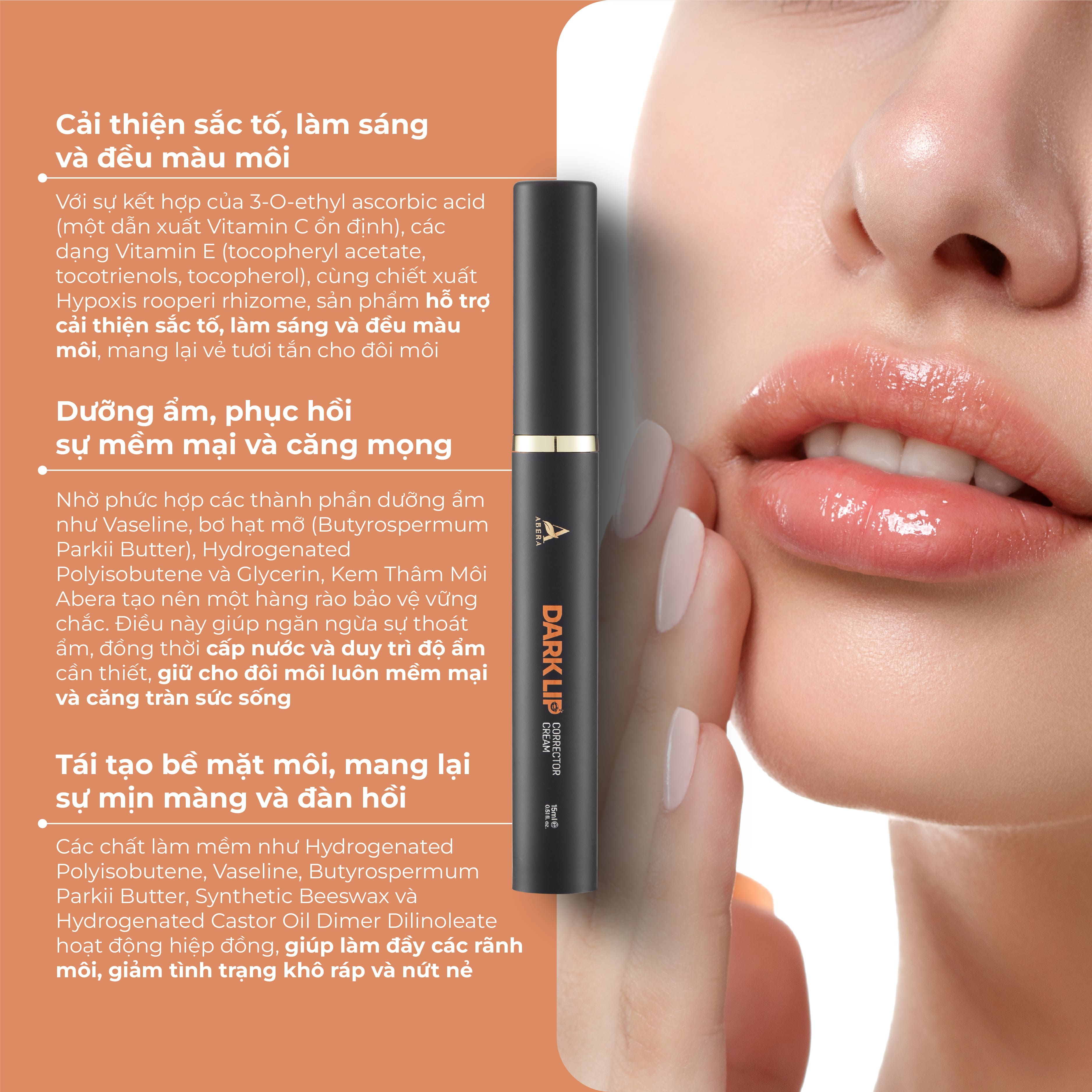 Kem Thâm Môi Abera là giải pháp hiệu quả cho những ai gặp vấn đề môi thâm, bong tróc, nứt nẻ. Sản phẩm chứa các thành phần giàu dưỡng chất như vaseline, vitamin C, sáp ong, có công dụng hỗ trợ cấp ẩm cho da môi, giảm thâm và làm hồng môi.