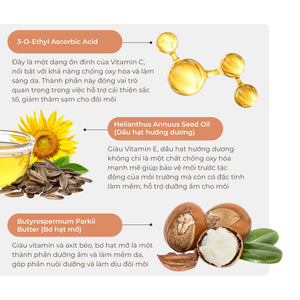 - Chiết xuất hạt hướng dương: Hỗ trợ dưỡng ẩm cho da môi, hạn chế tình trạng da môi mất nước, bong tróc và sần sùi.